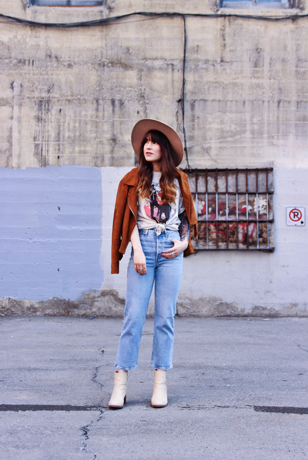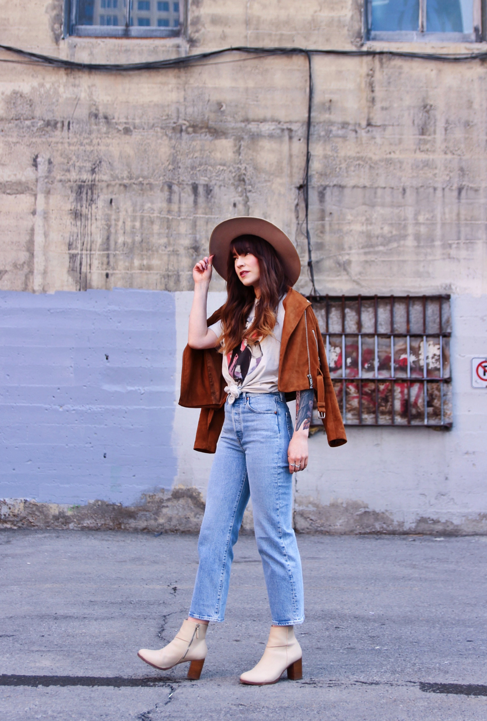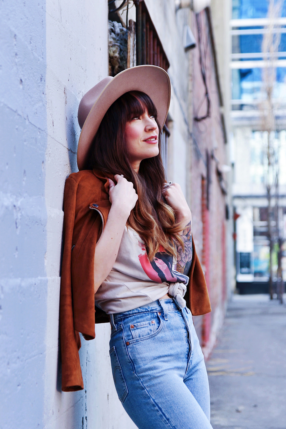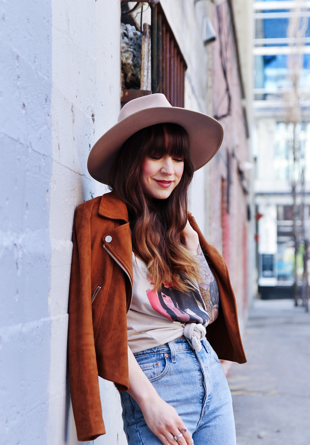Now that it’s basically spring here in Calgary, i’m trying to incorporate a little more colour into my outfits. This’s a casual look for in between weather, and honestly you just can’t go wrong with a pair of jeans and a band tee. I found this faux suede Moto jacket in the back of my closet, and thought that it was the perfect addition to this look. To accessorize I added my favourite wide brim hat!