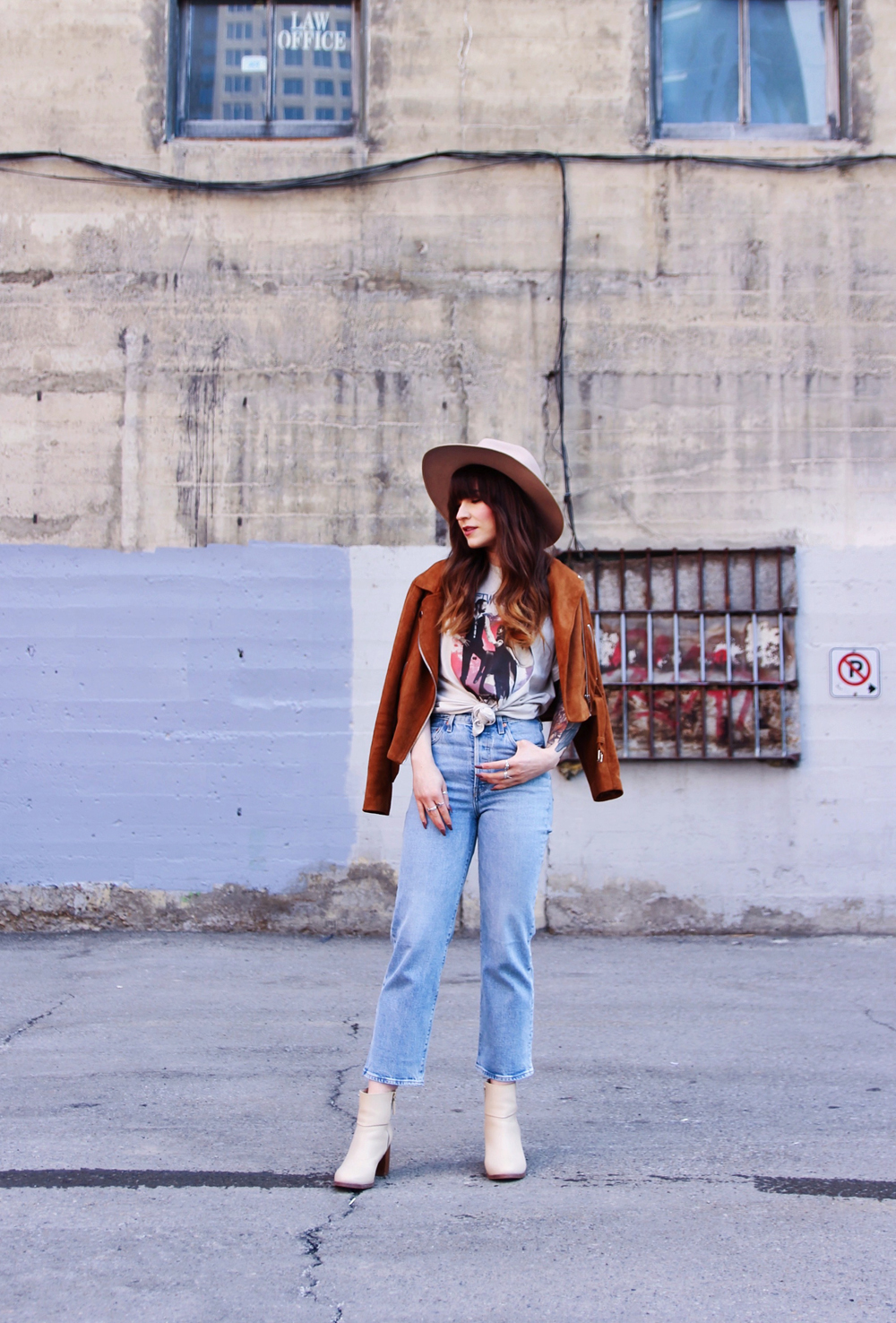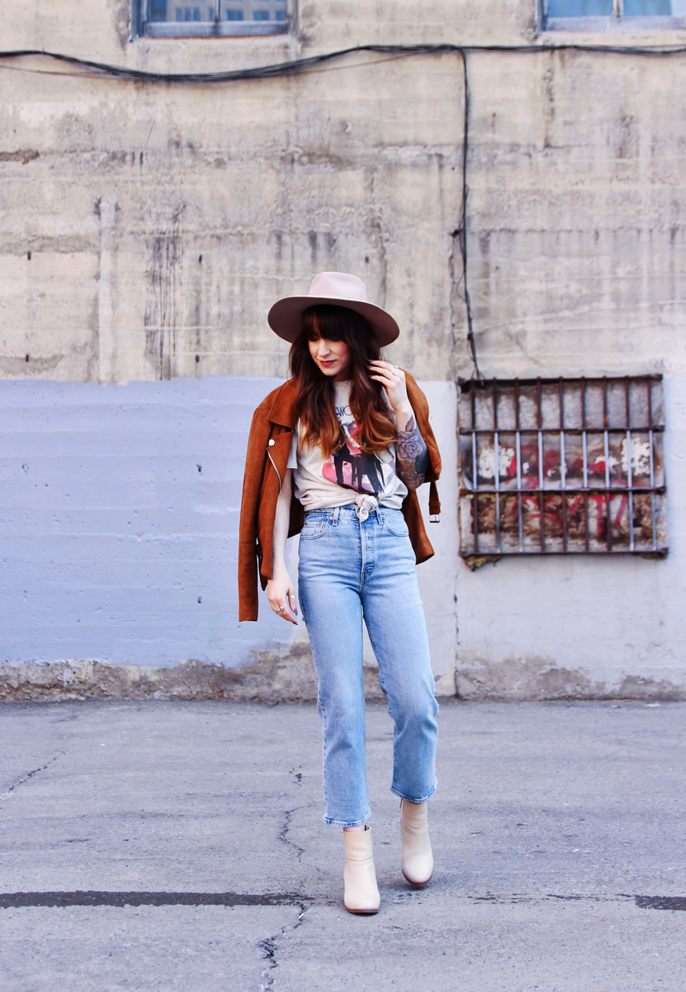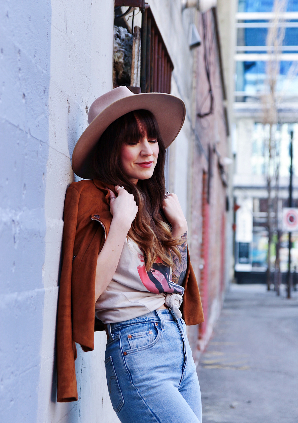 Now that it’s basically spring here in Calgary, i’m trying to incorporate a little more colour into my outfits. This’s a casual look for in between weather, and honestly you just can’t go wrong with a pair of jeans and a band tee. I found this faux suede Moto jacket in the back of my closet, and thought that it was the perfect addition to this look. To accessorize I added my favourite wide brim hat!