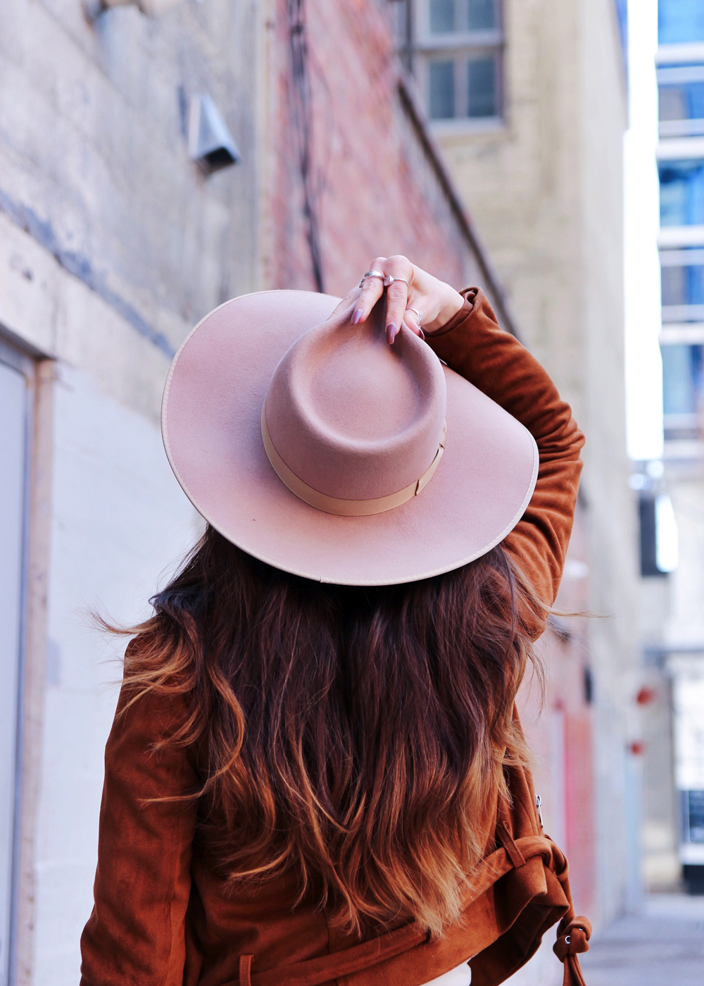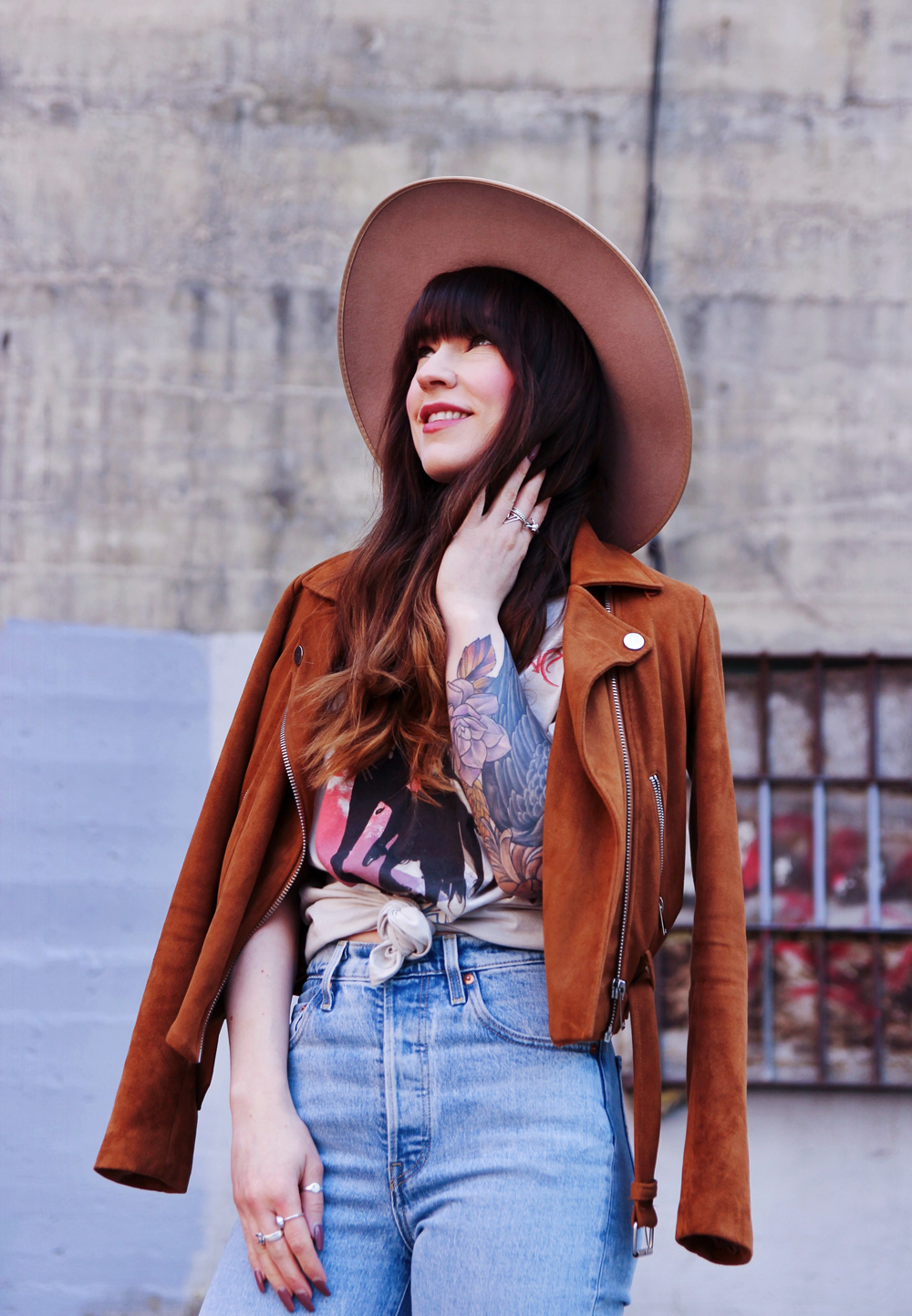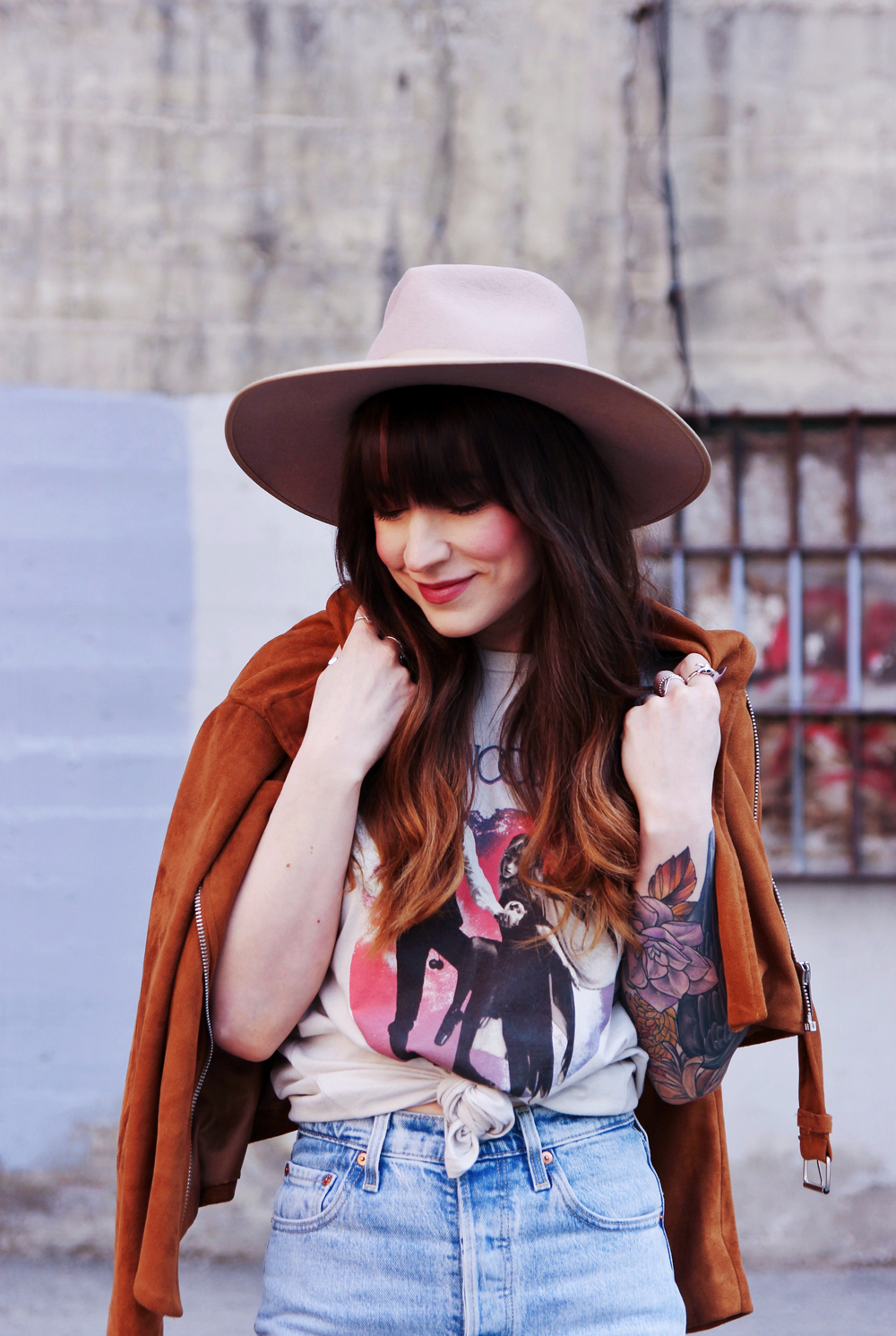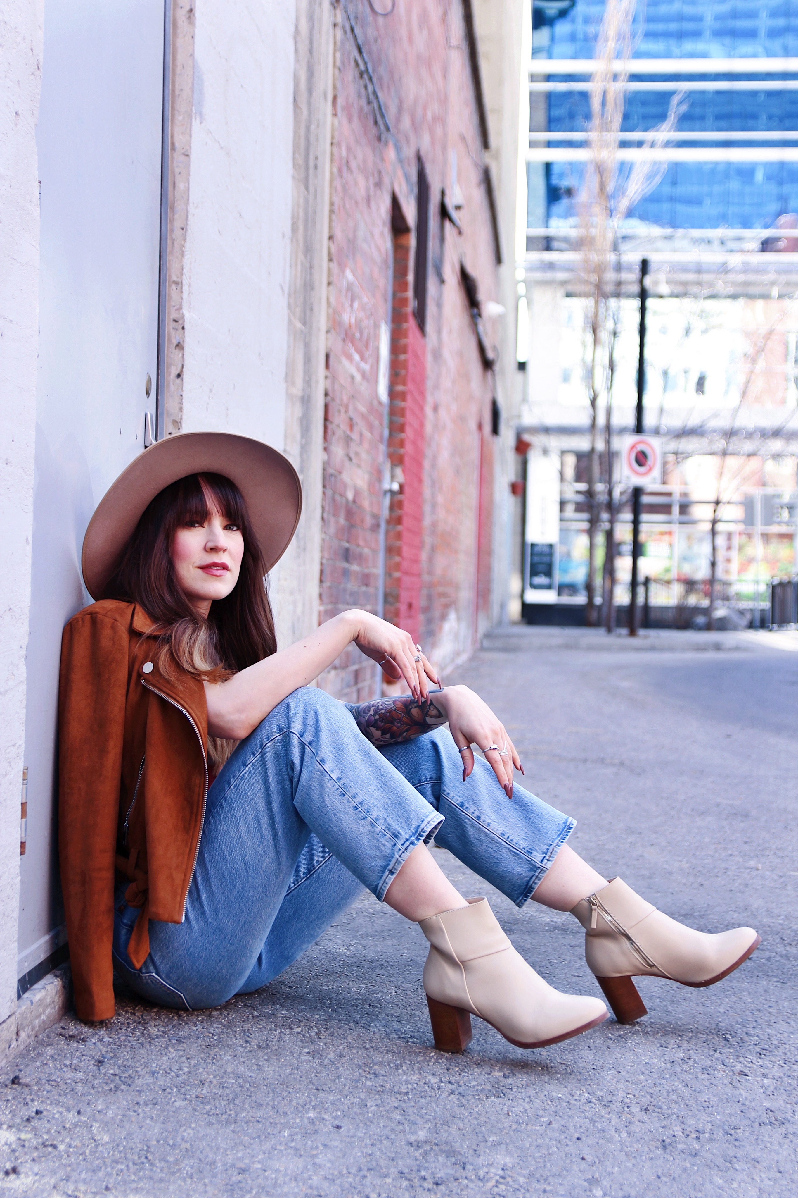 Now that it’s basically spring here in Calgary, i’m trying to incorporate a little more colour into my outfits. This’s a casual look for in between weather, and honestly you just can’t go wrong with a pair of jeans and a band tee. I found this faux suede Moto jacket in the back of my closet, and thought that it was the perfect addition to this look. To accessorize I added my favourite wide brim hat!