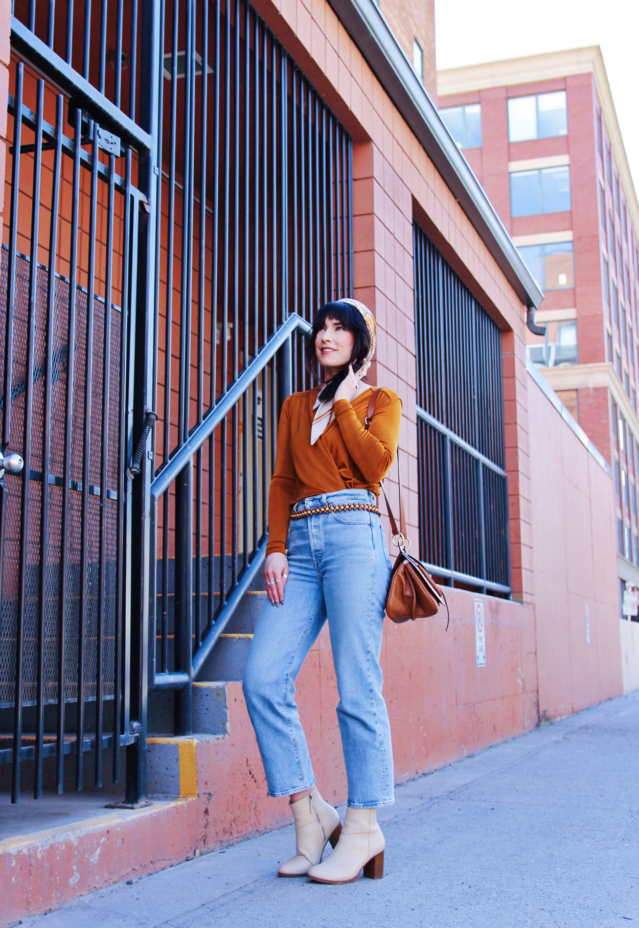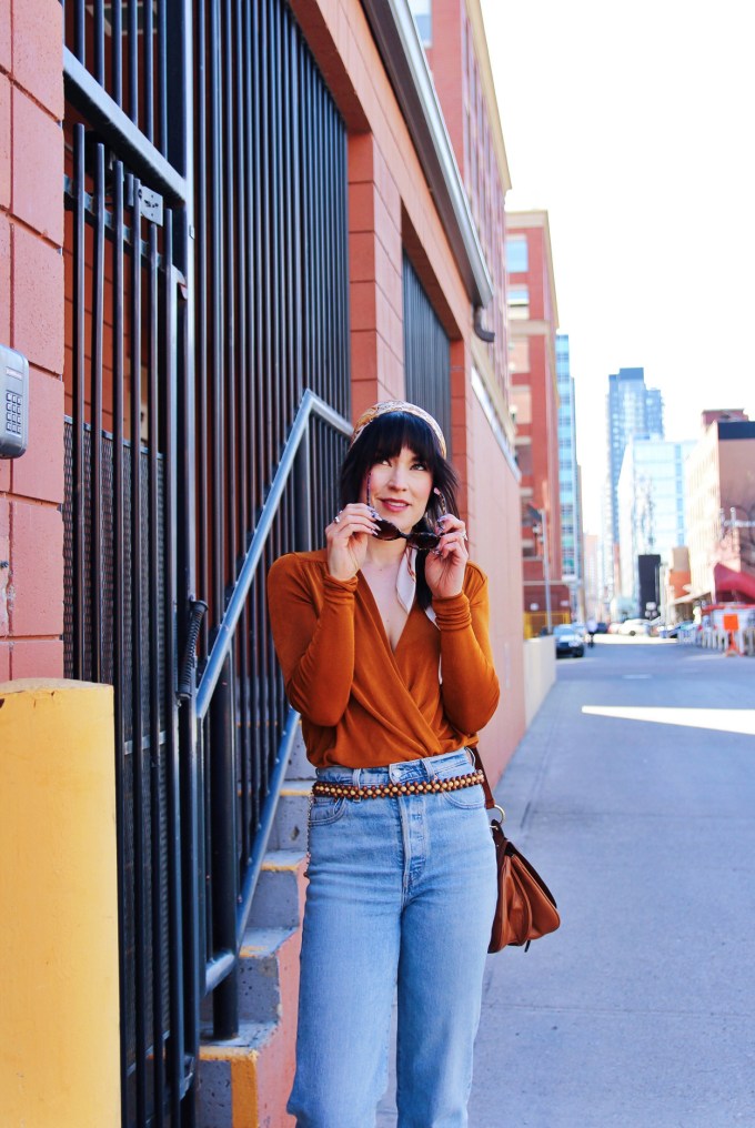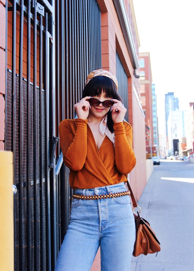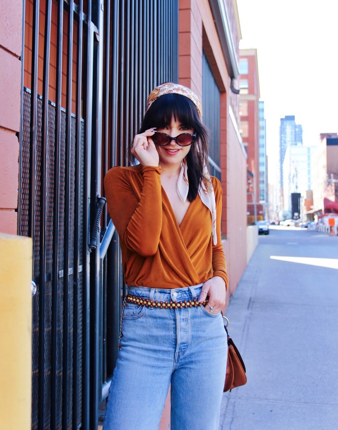 I’ve been really into 70’s aesthetics lately, so that’s where the inspiration for this look is coming from. That being said, i’m currently obsessed with this orange bodysuit from Free People. The colour, the fit, everything about it’s awesome! I added my favourite pair of levi’s, and these cream coloured boots by Thursday Boot Co. To accessorize I added a scarf, and this awesome wooden beaded belt that I found in a thrift store!