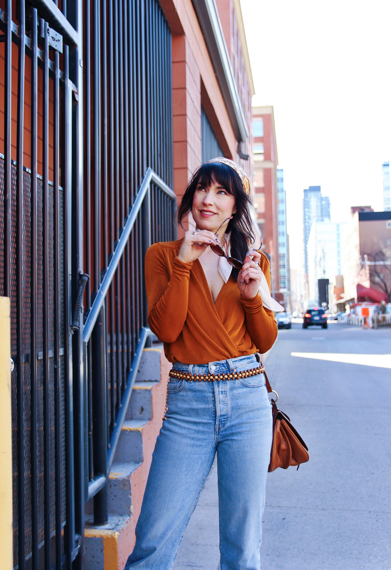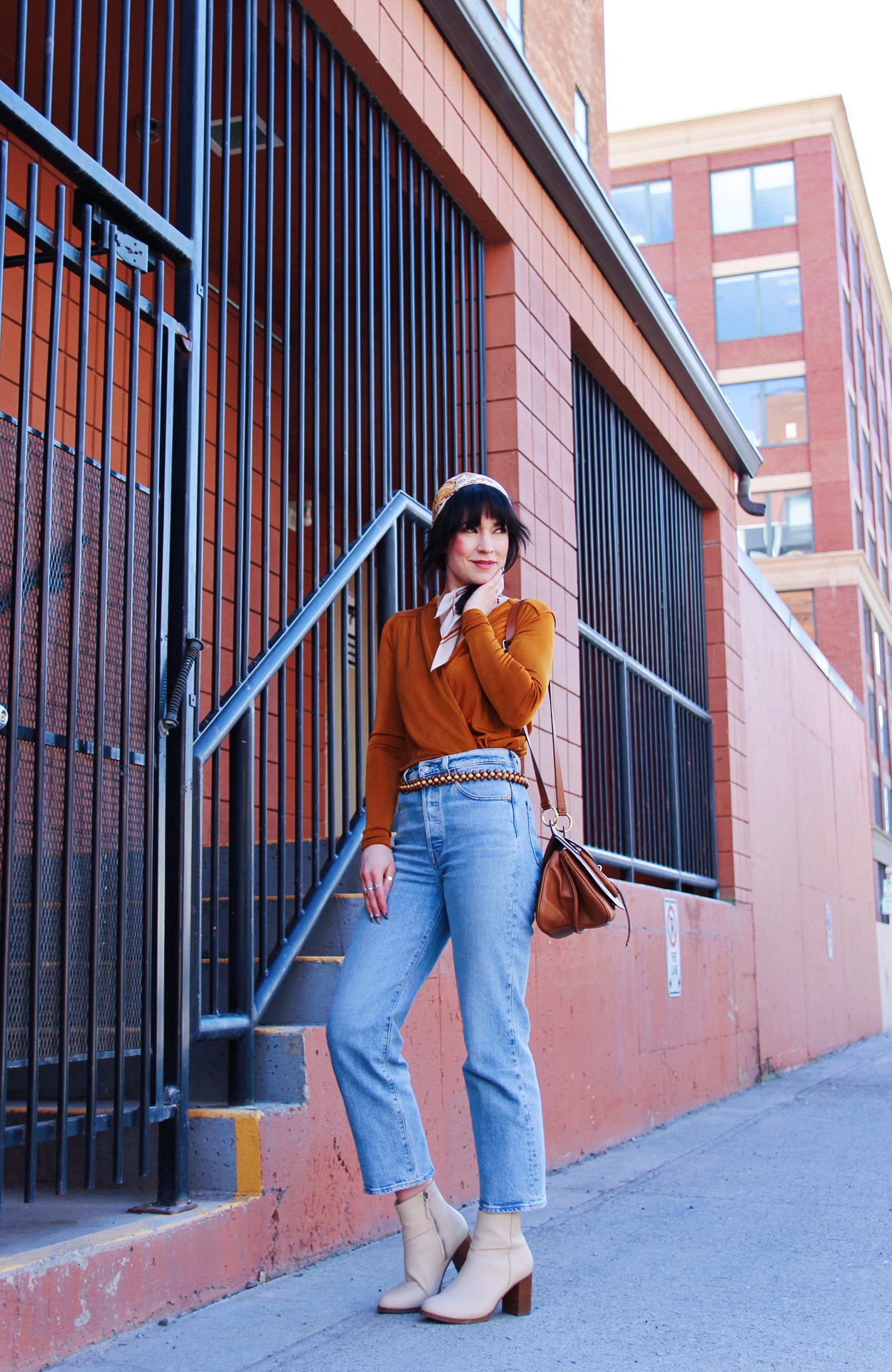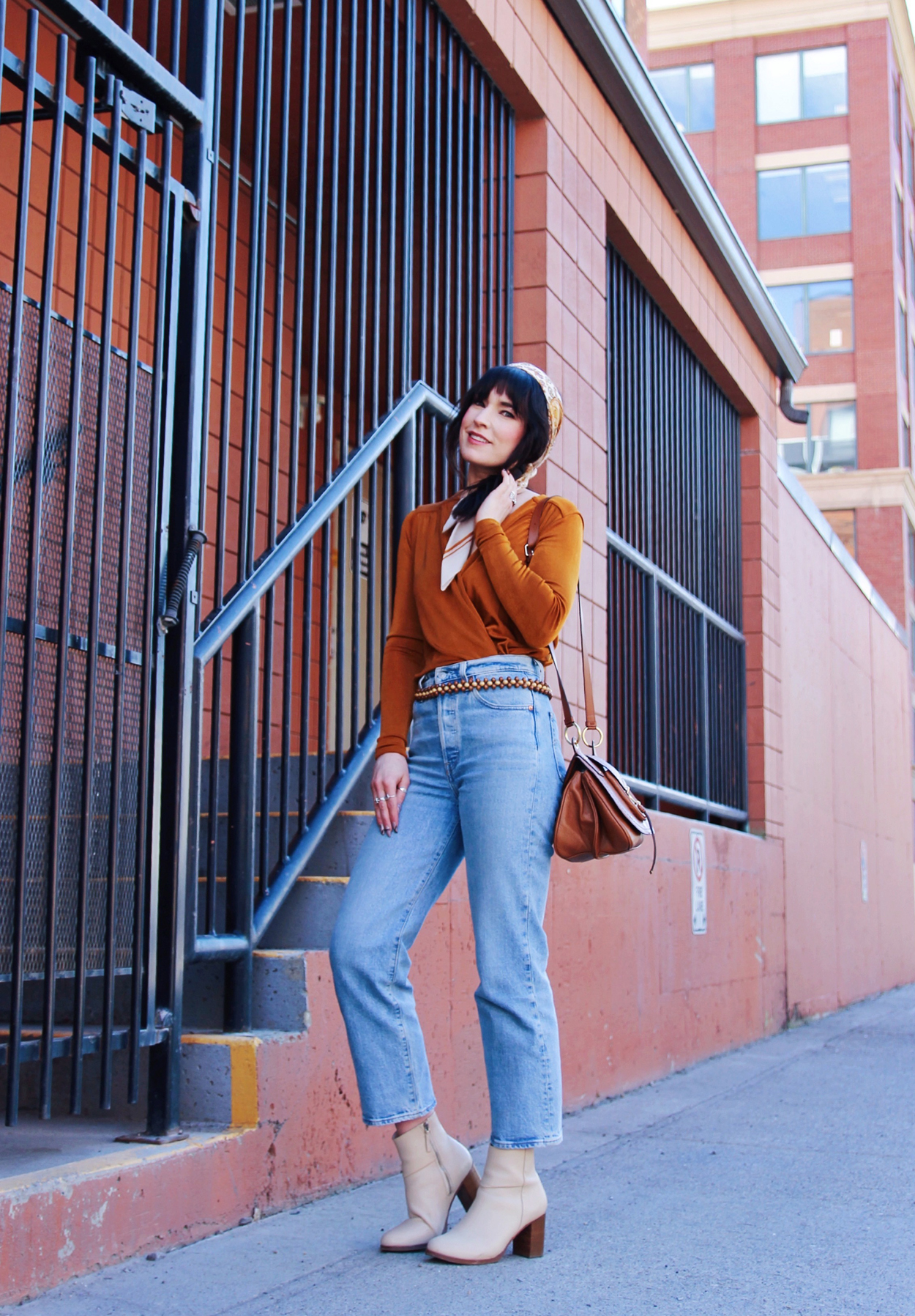 I’ve been really into 70’s aesthetics lately, so that’s where the inspiration for this look is coming from. That being said, i’m currently obsessed with this orange bodysuit from Free People. The colour, the fit, everything about it’s awesome! I added my favourite pair of levi’s, and these cream coloured boots by Thursday Boot Co. To accessorize I added a scarf, and this awesome wooden beaded belt that I found in a thrift store!