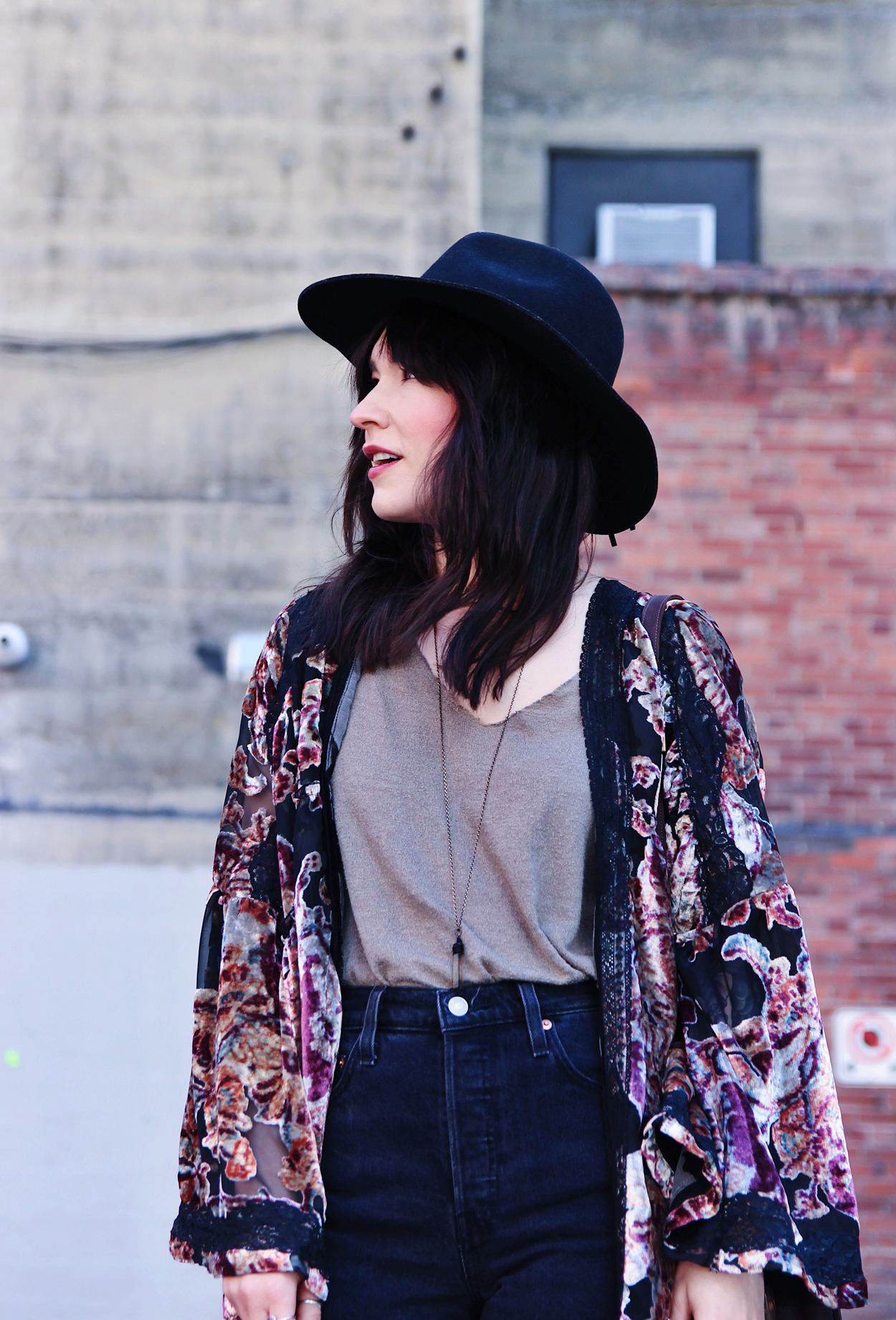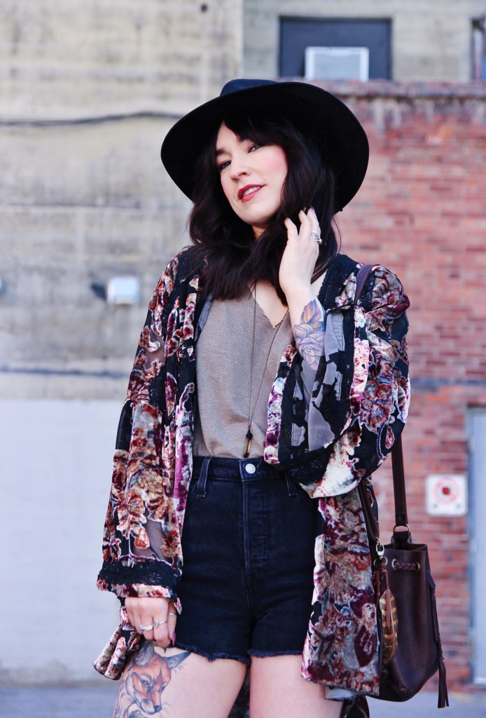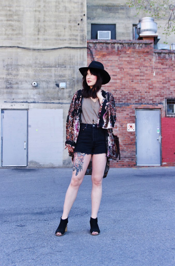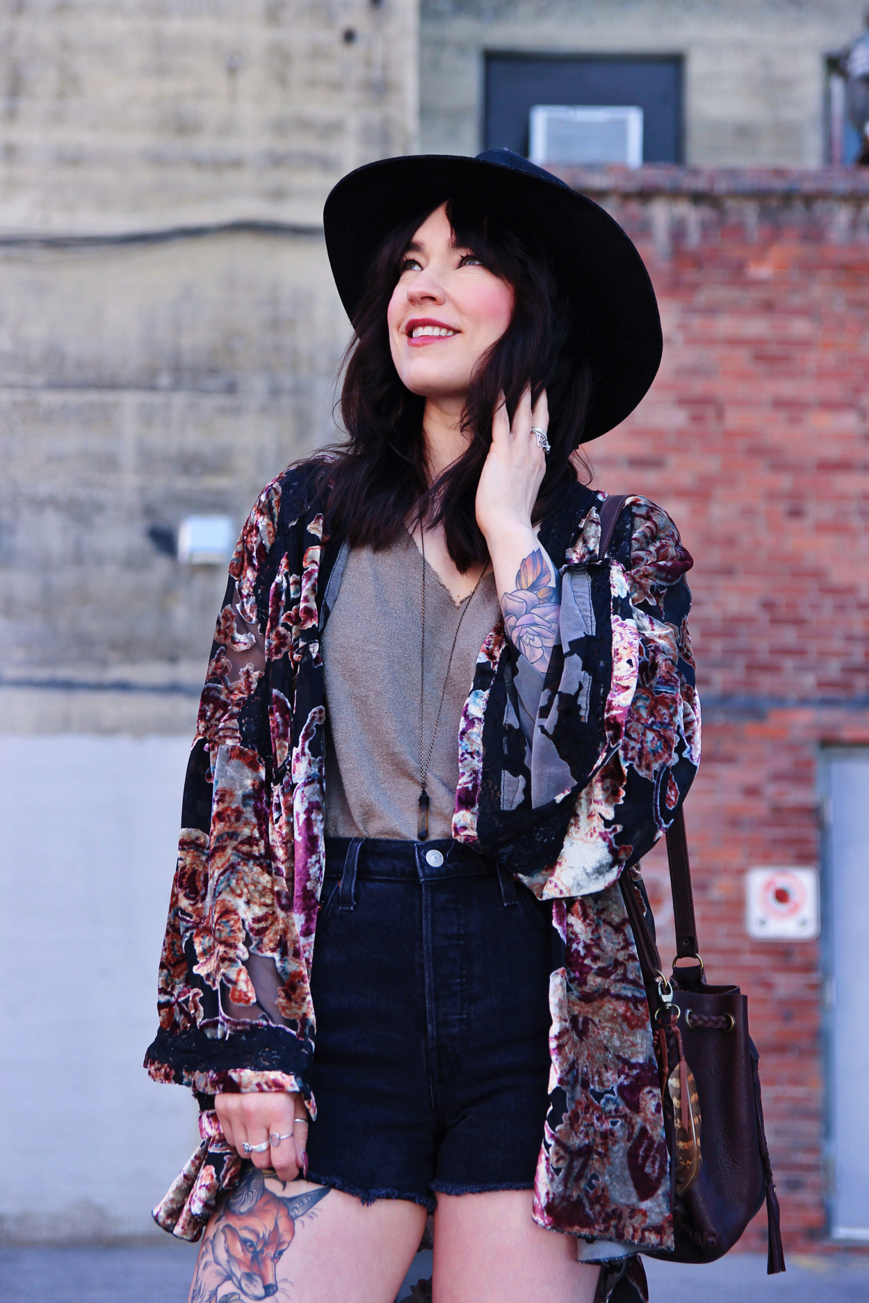 We’ve finally had a few days of nice weather in Calgary, so i’ve been picking out and styling some warm weather outfits. This look in particular features a new pair of Levi’s ribcage shorts that i’ve recently added to my wardobe. I love the rise, and the dark wash denim! As for the rest of the look, I added a few old favourites including this velvet shawl, and wide brimmed hat.