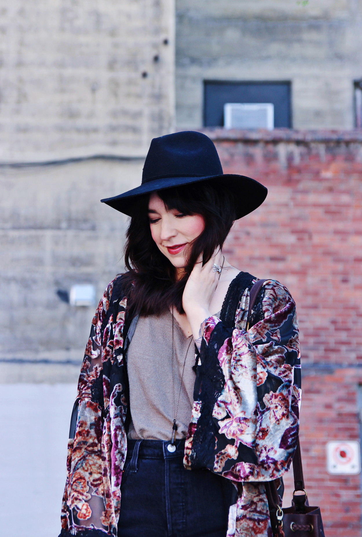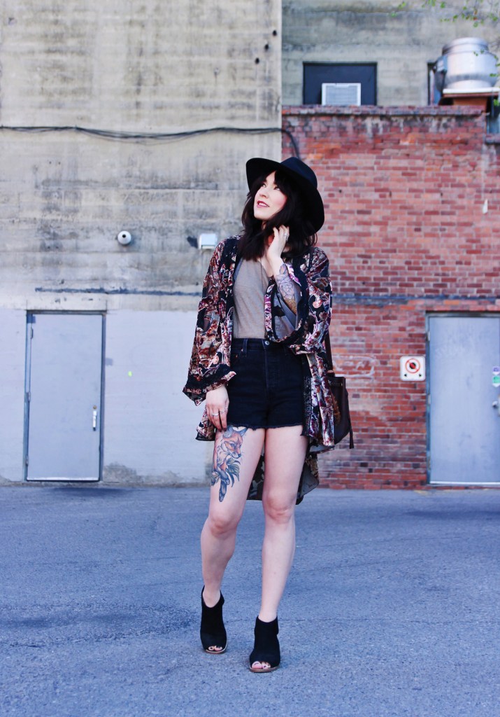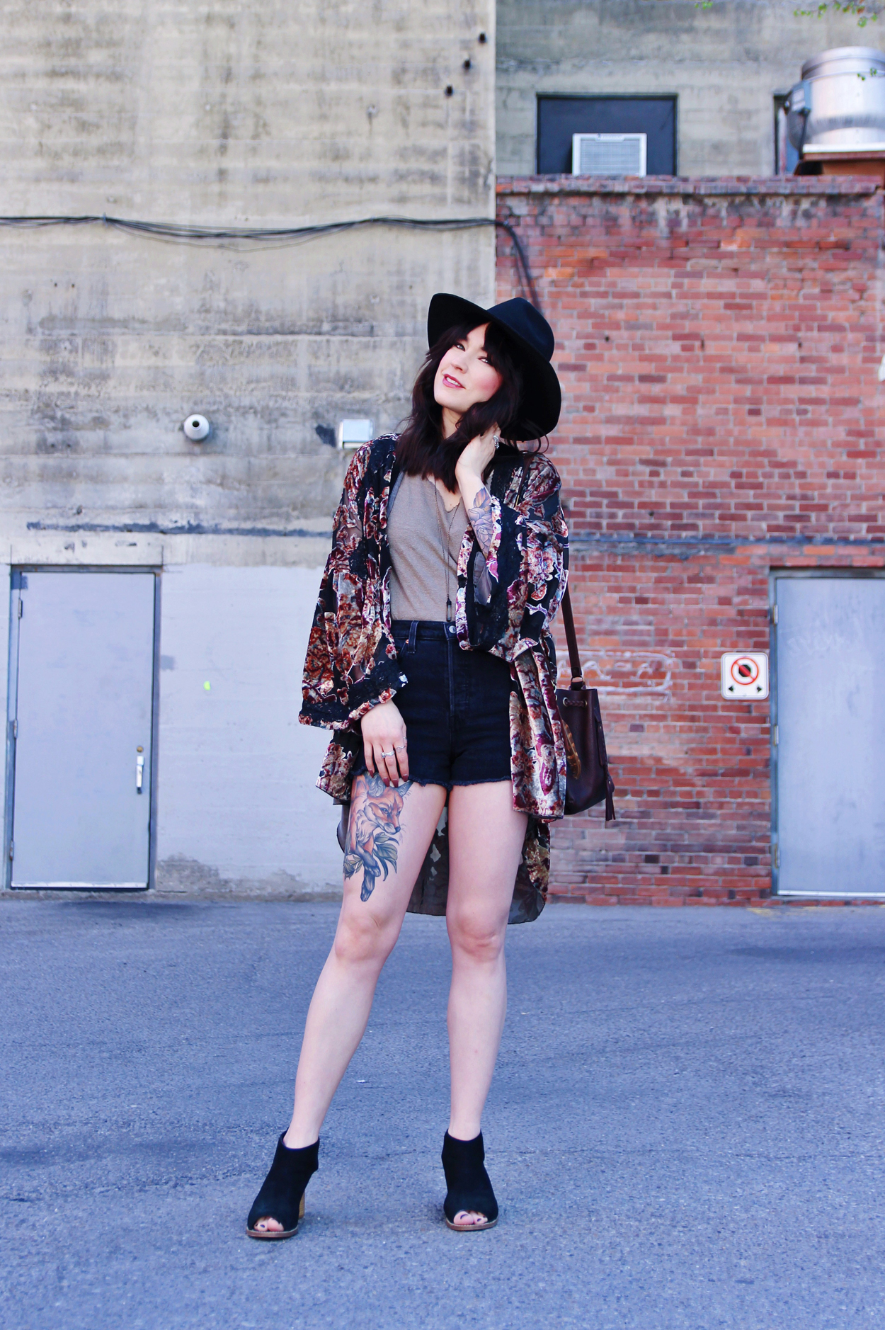 We’ve finally had a few days of nice weather in Calgary, so i’ve been picking out and styling some warm weather outfits. This look in particular features a new pair of Levi’s ribcage shorts that i’ve recently added to my wardobe. I love the rise, and the dark wash denim! As for the rest of the look, I added a few old favourites including this velvet shawl, and wide brimmed hat.