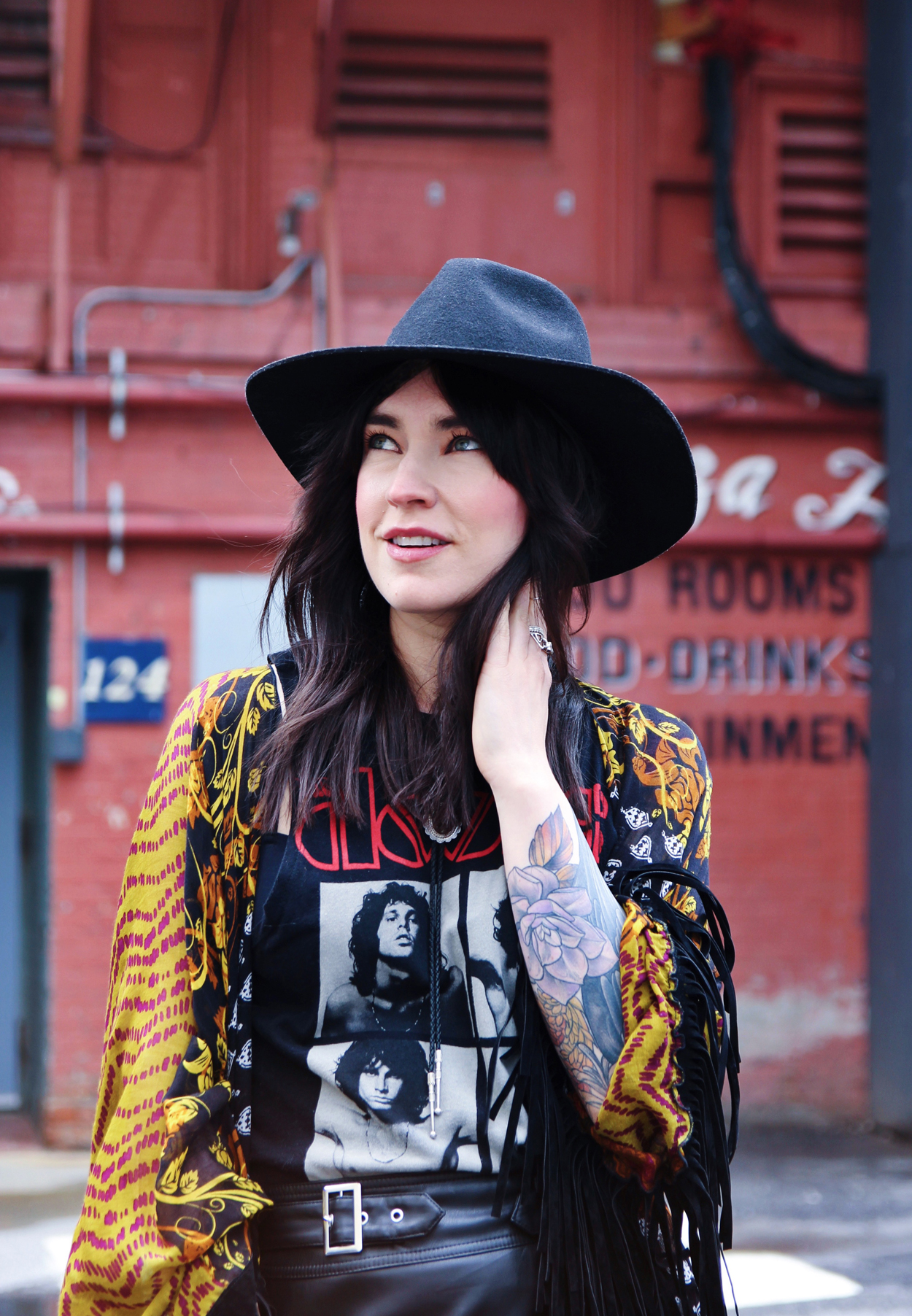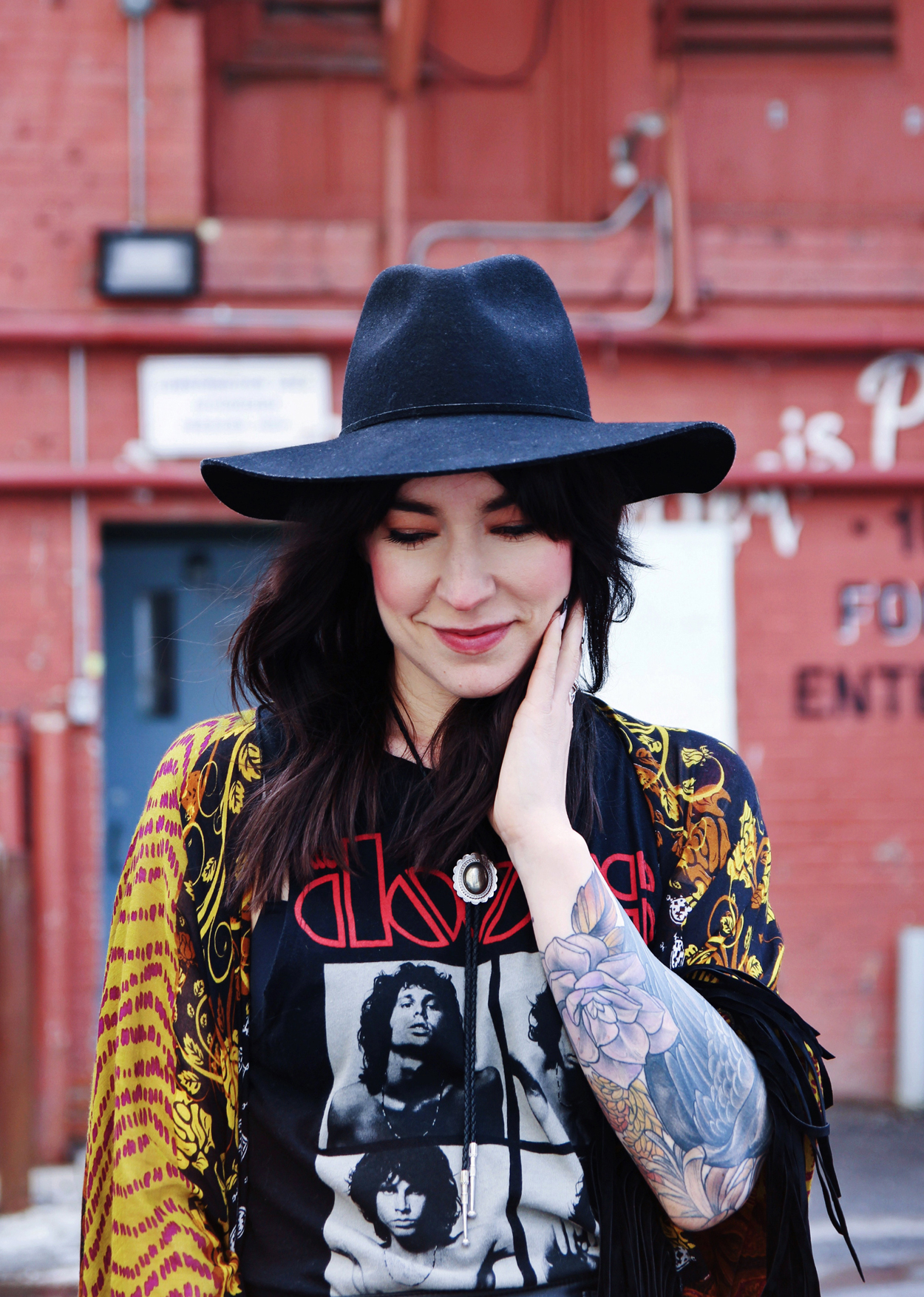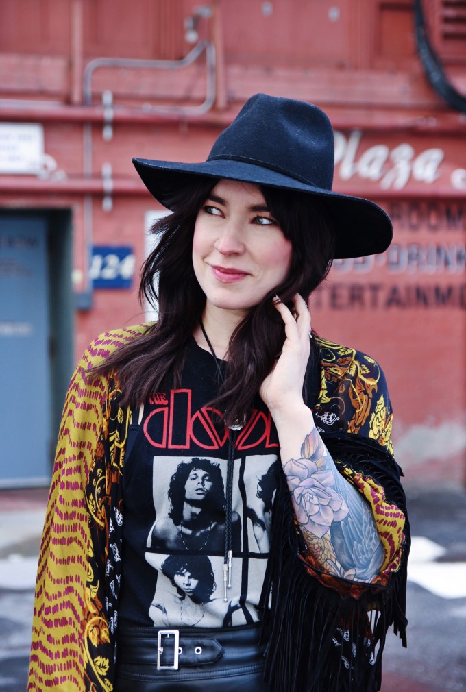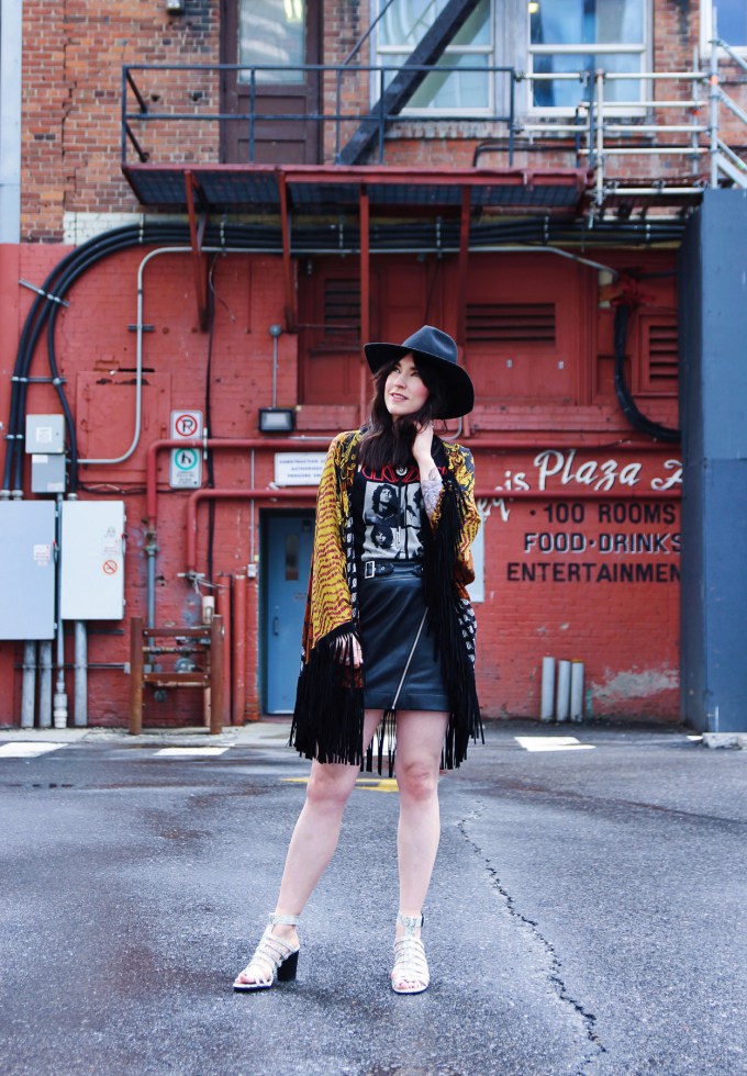 Outfit Details: Kimono: Free People / Skirt: Urban Outfitters / Tank: Forever 21 / Bolo: Free People / Sandals: C/O Vionic / Hat: Lack of Color