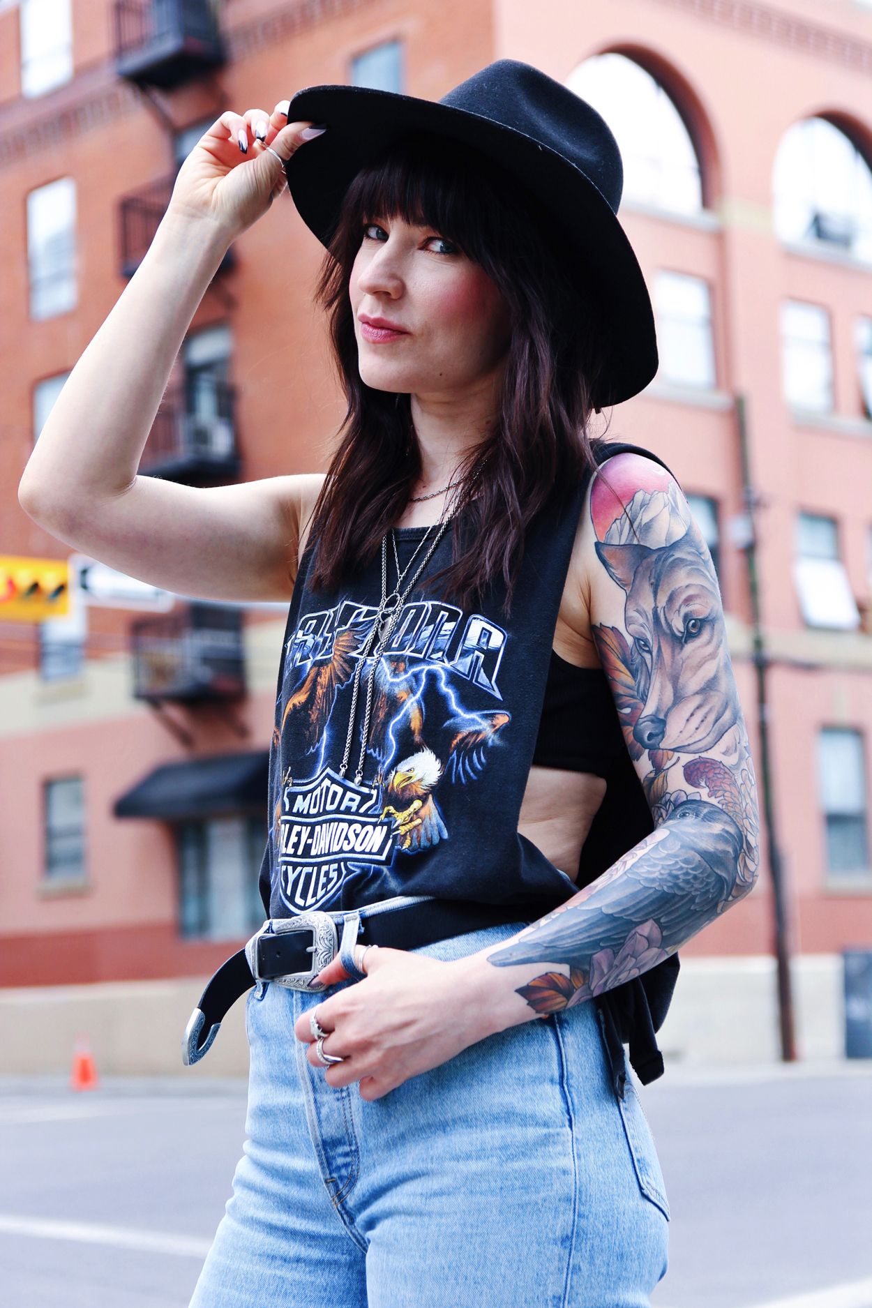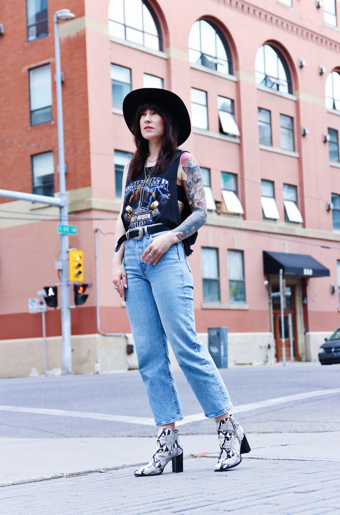 Outfit Details: Tank: Vintage / Jeans: Levi’s / Hat: Lack of Color / Necklace: Free People / Boots: Aldo