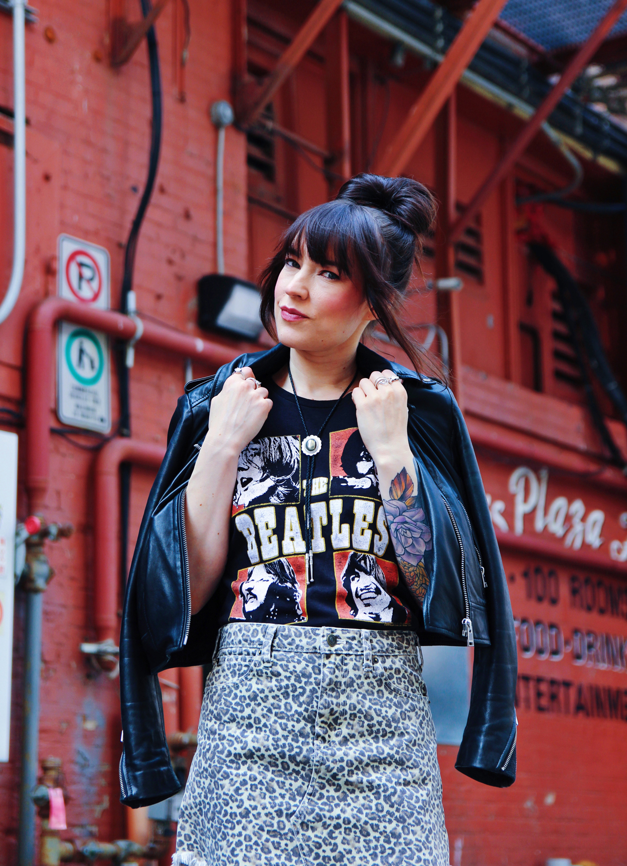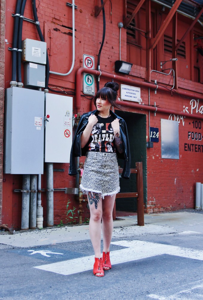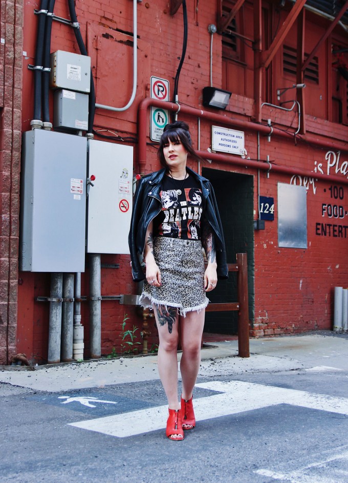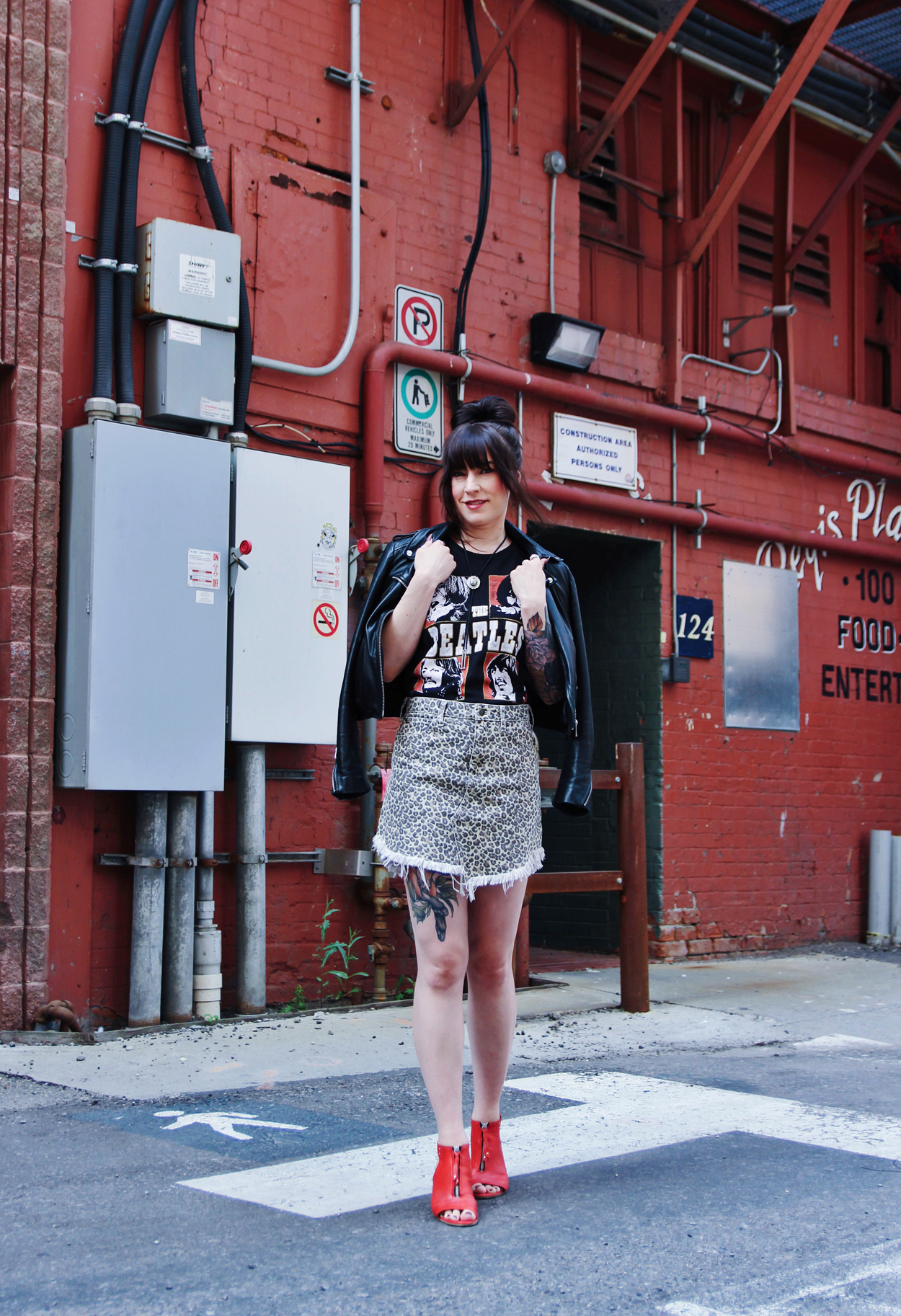 This look consists of a few of my wardobe staples, including this leather jacket, which is an absolute favourite of mine. I also recently cut this Beatles tee into a muscle tank, and I think i’ll get more wear out of it now. For the rest of the look I chose this leopard print skirt that I bought last year, and these red booties to add a pop of colour!