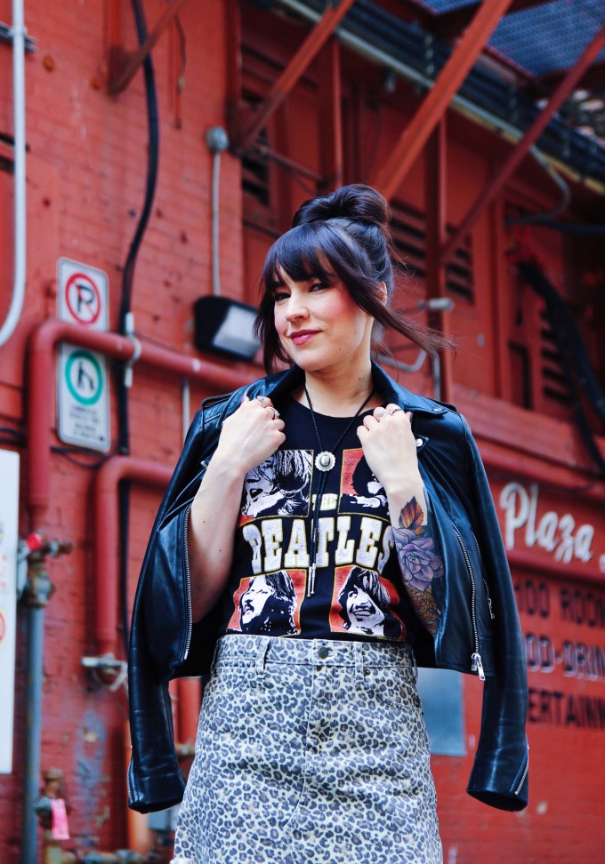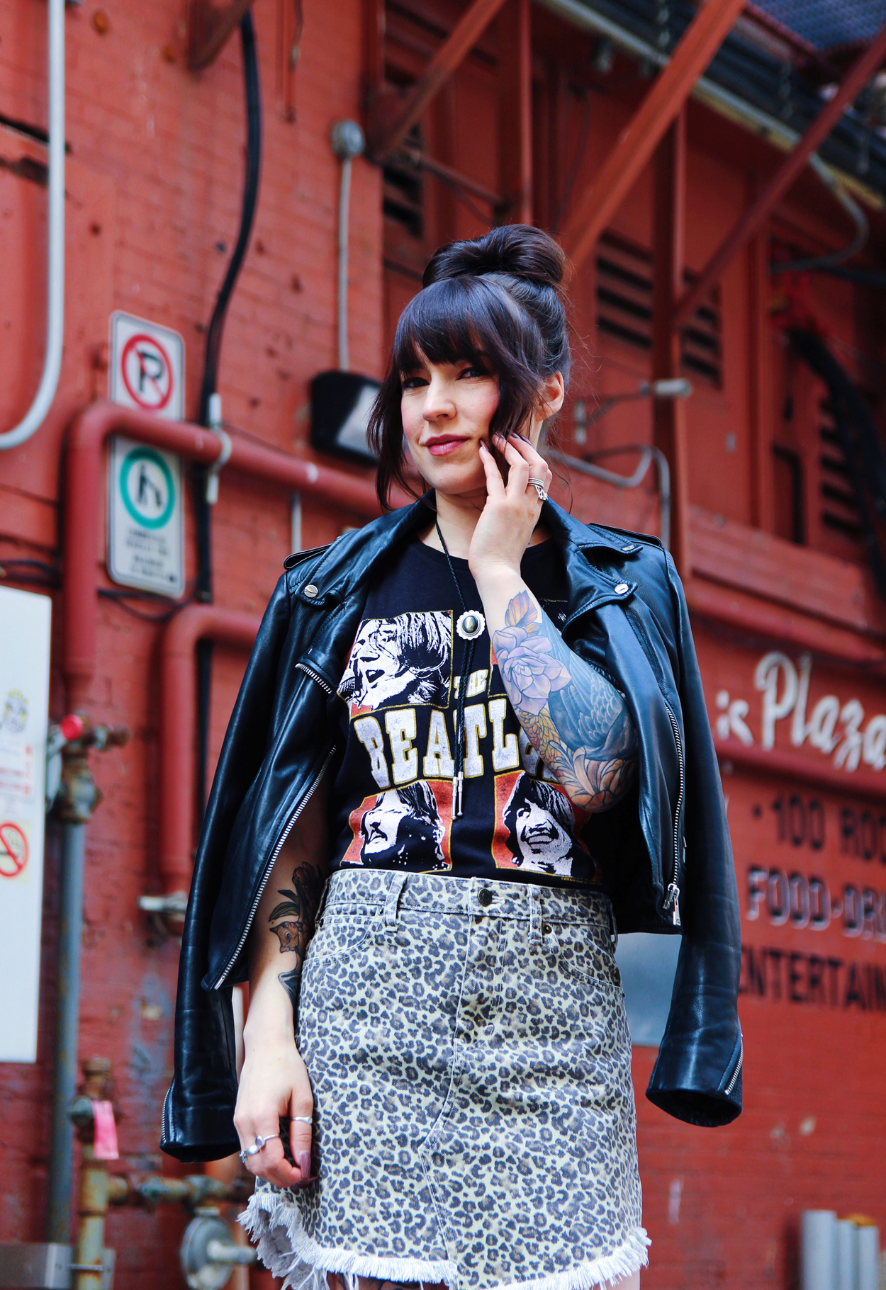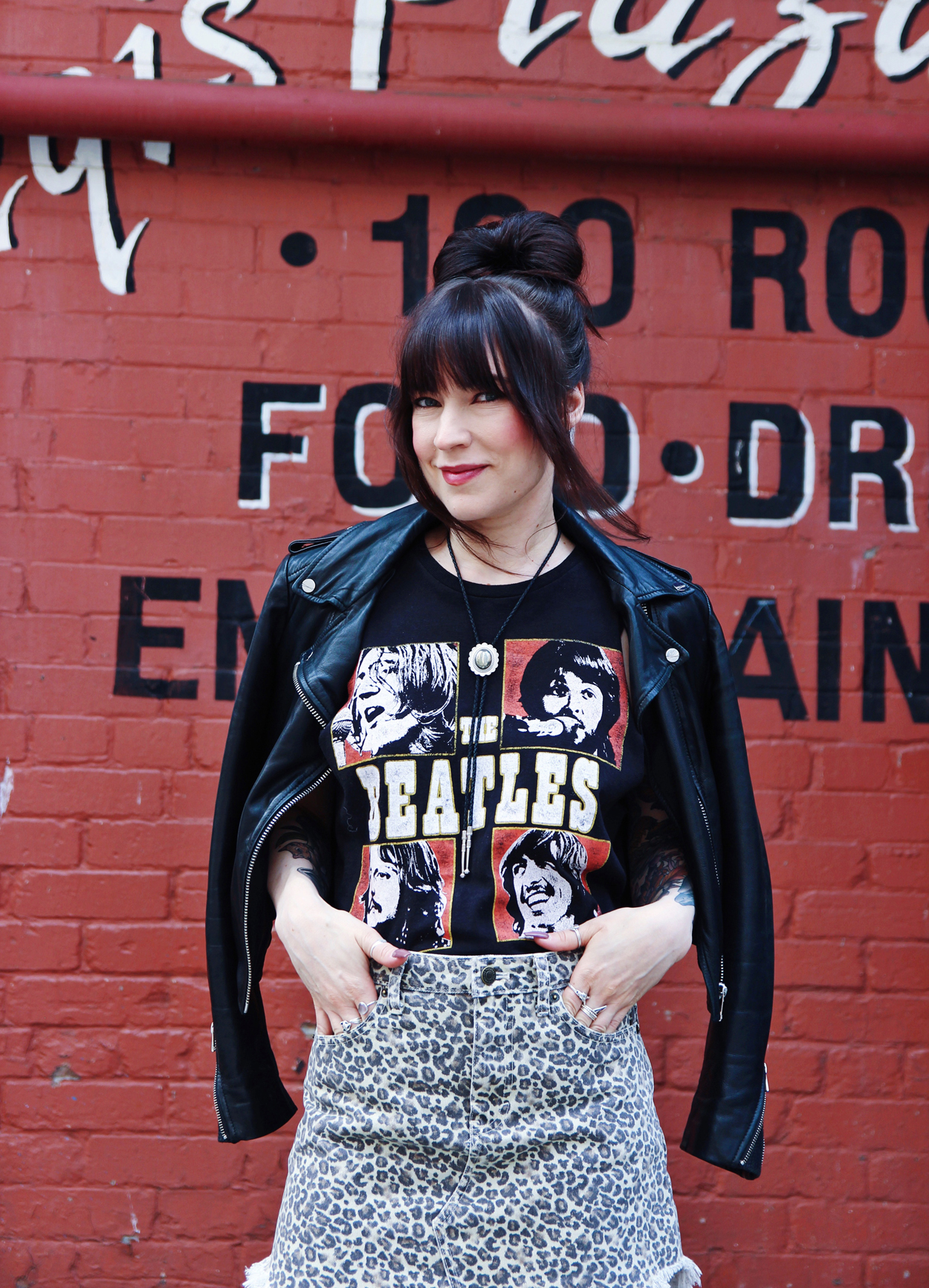 This look consists of a few of my wardobe staples, including this leather jacket, which is an absolute favourite of mine. I also recently cut this Beatles tee into a muscle tank, and I think i’ll get more wear out of it now. For the rest of the look I chose this leopard print skirt that I bought last year, and these red booties to add a pop of colour!