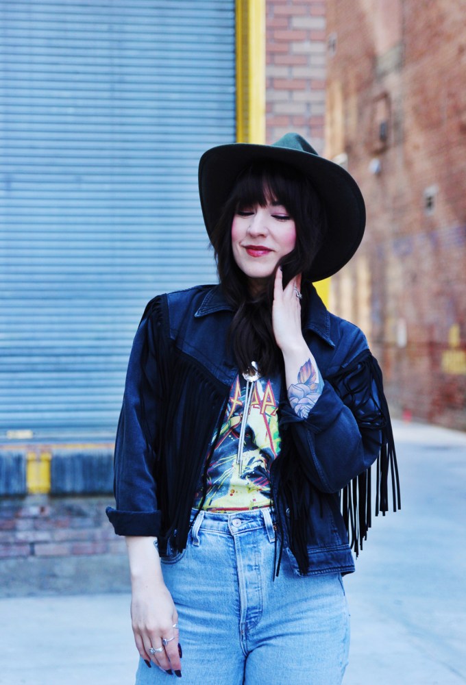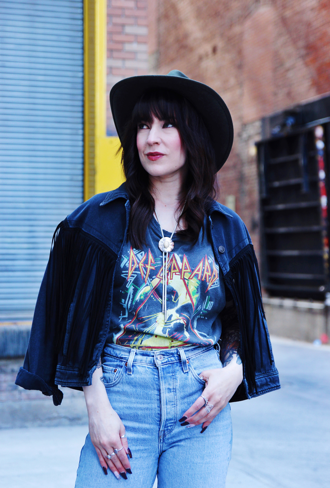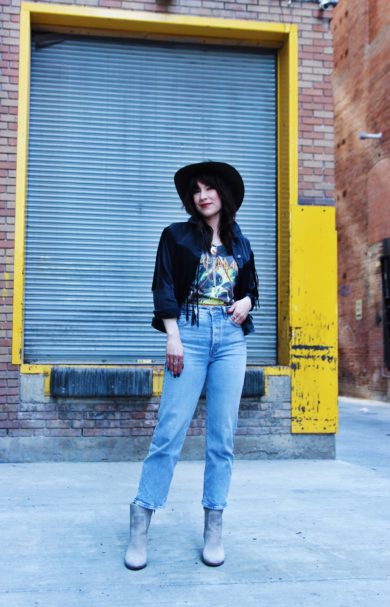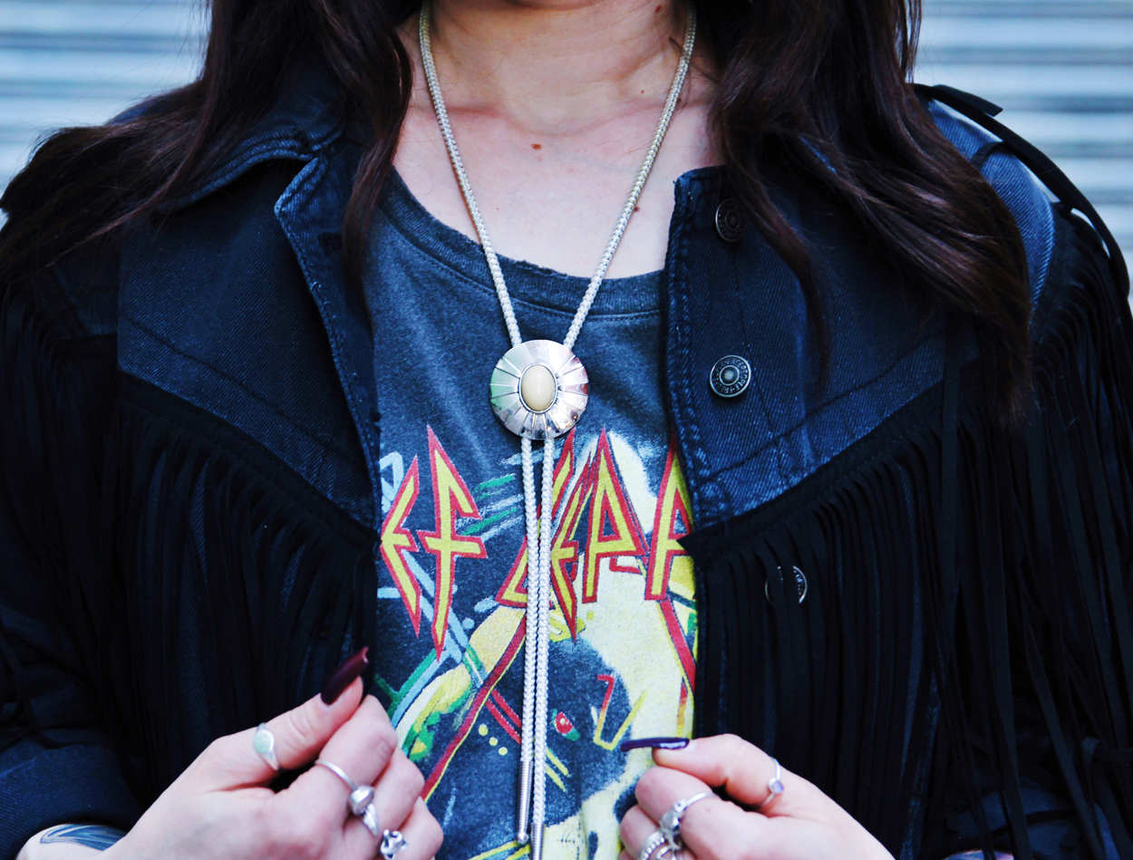 Outfit Details: Jacket: Free People / Jeans: Levi’s / Boots: C/O Vionic / Top: Free People / Bolo: C/O Good Gals Vintage