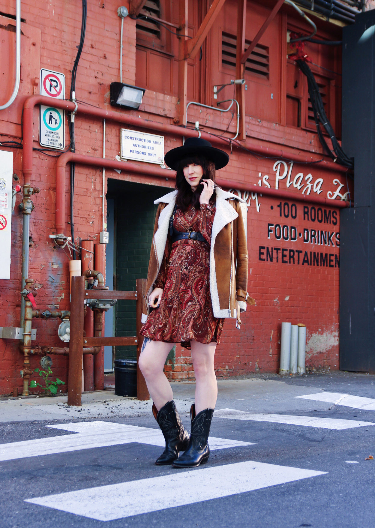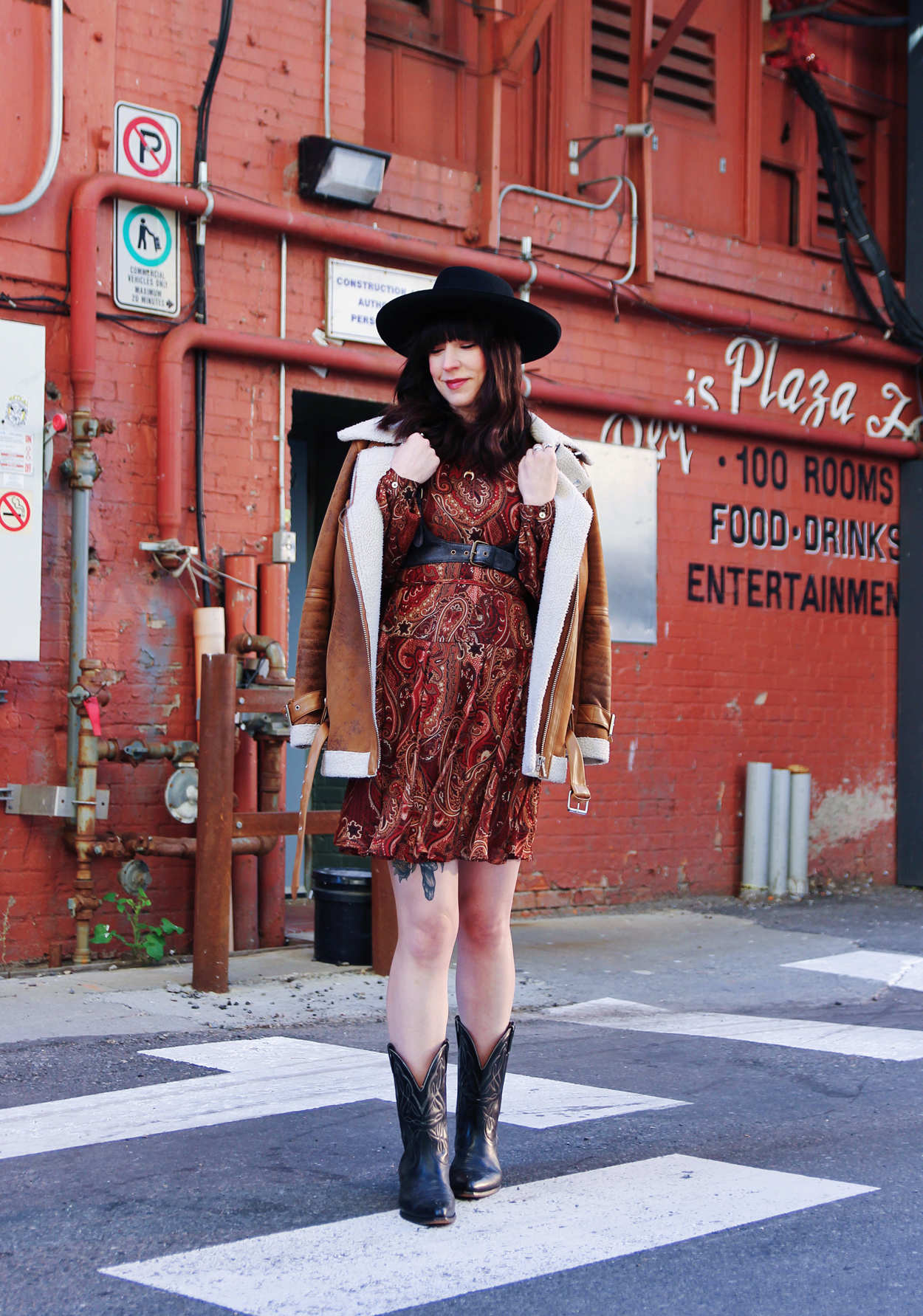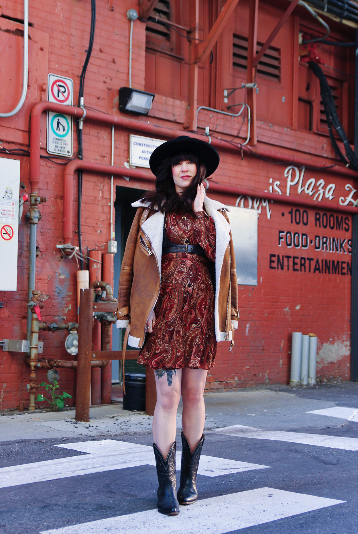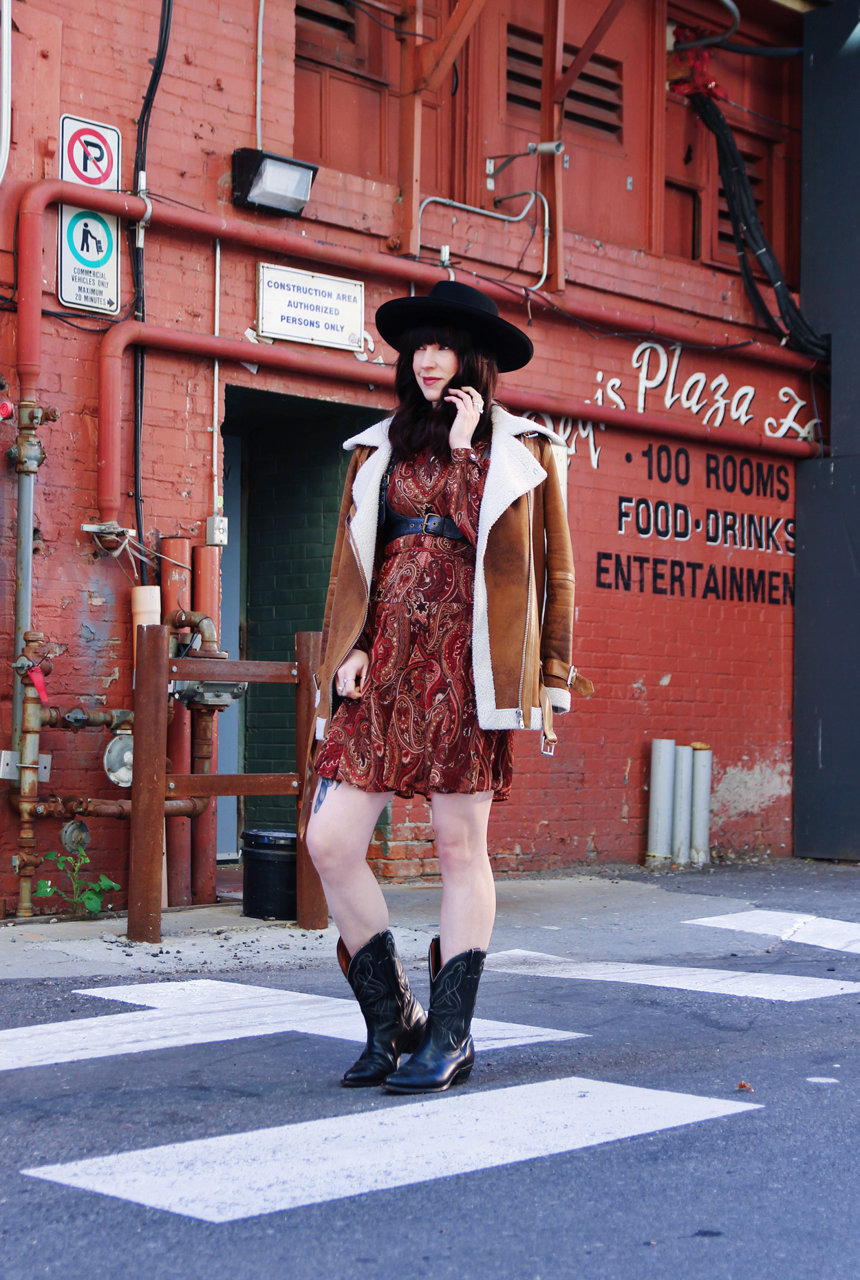 Fall is always the best time of year for fashion. There’re so many options when it comes to adding layers, and you’re not confined to functionality the way you are in winter. I always love to play around with patterns and textures, and this look is no exception. I found this paisley dress by Tommy Hilfigure, and I think it’s the perfect addition to my wardobe! I love the pattern and the fit is perfect! I paired it with one of my favourite coats, and added a few new accessories to complete the look. This harness belt from Free People adds the perfect amount of detail to this look. I’m also currently obsessed with these cowboy boots that I thrifted.