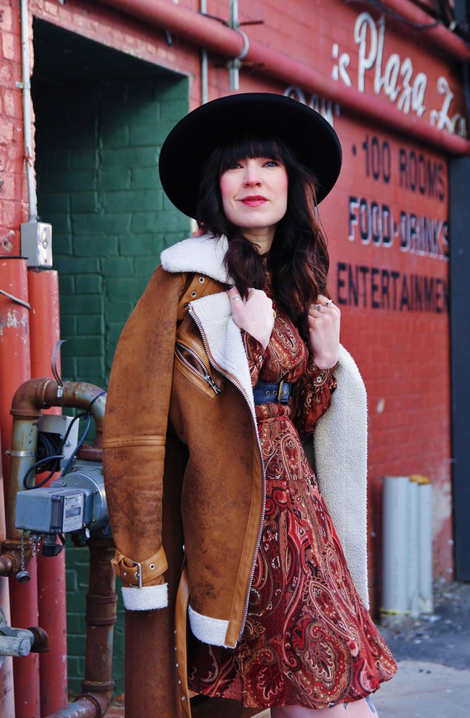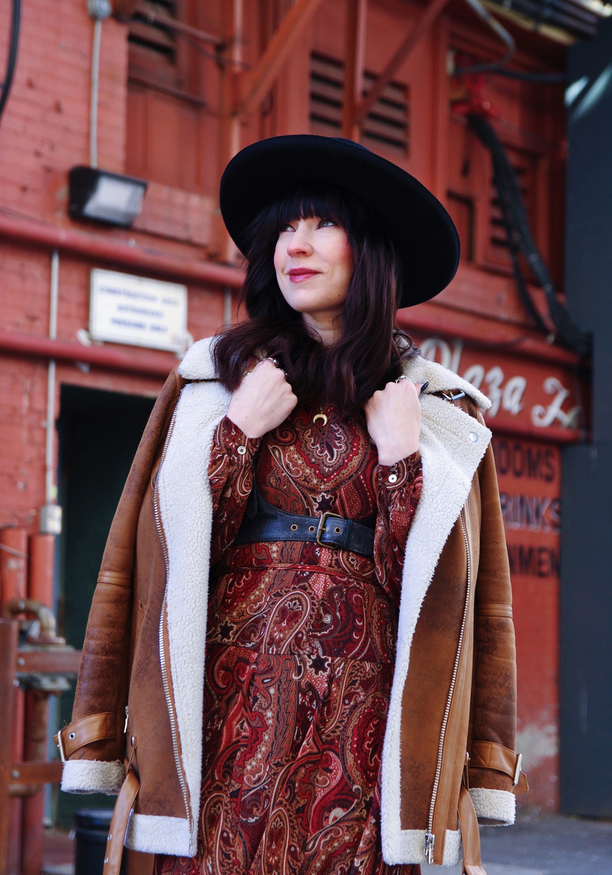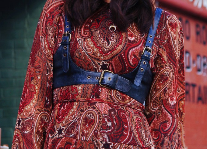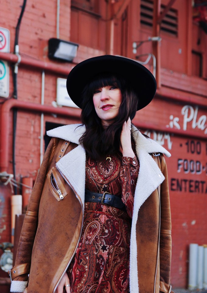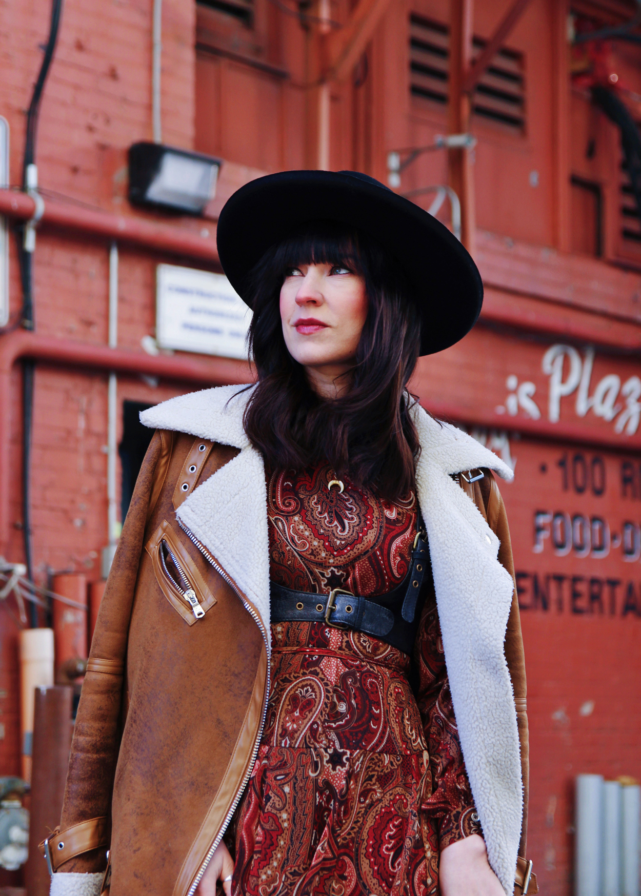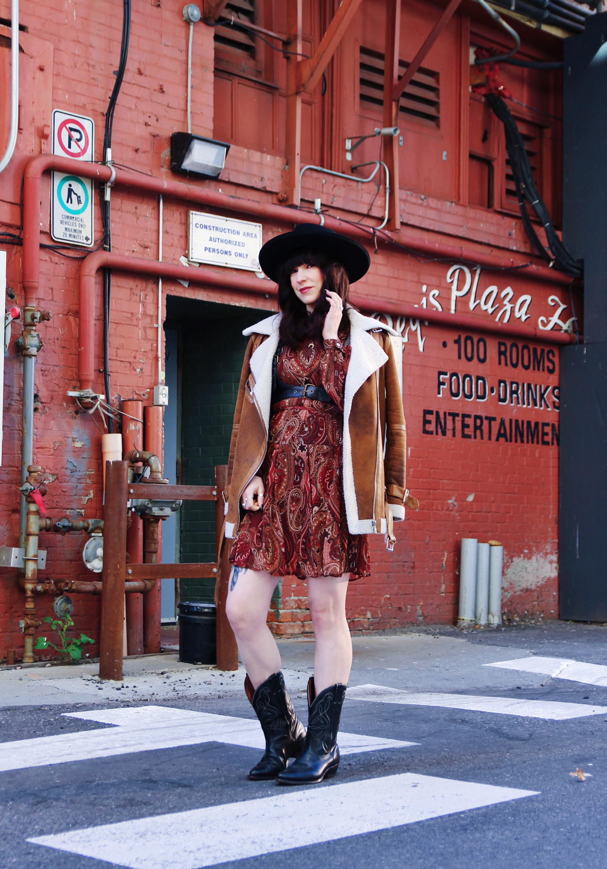 Fall is always the best time of year for fashion. There’re so many options when it comes to adding layers, and you’re not confined to functionality the way you are in winter. I always love to play around with patterns and textures, and this look is no exception. I found this paisley dress by Tommy Hilfigure, and I think it’s the perfect addition to my wardobe! I love the pattern and the fit is perfect! I paired it with one of my favourite coats, and added a few new accessories to complete the look. This harness belt from Free People adds the perfect amount of detail to this look. I’m also currently obsessed with these cowboy boots that I thrifted.