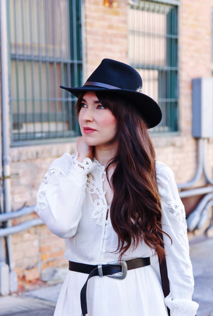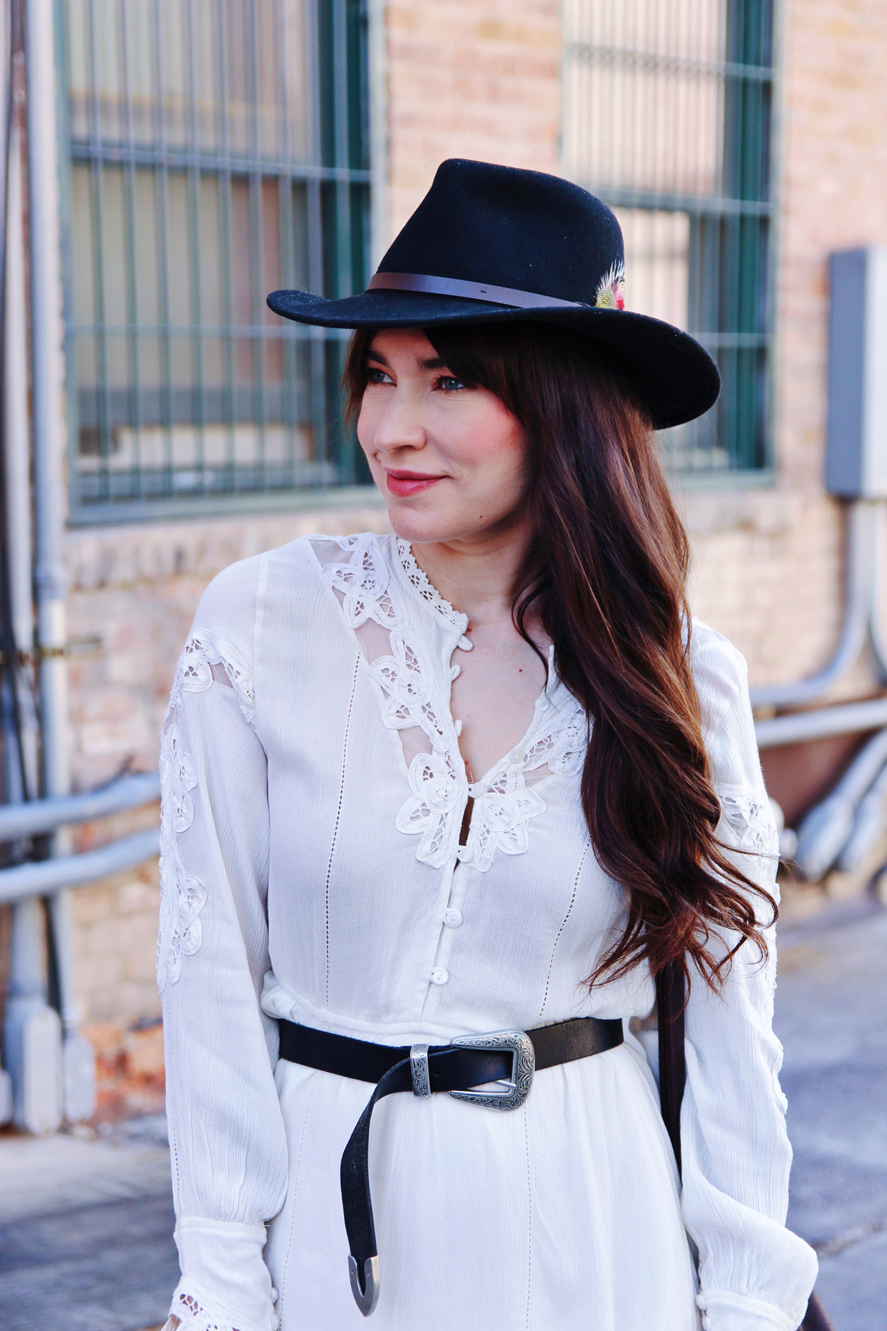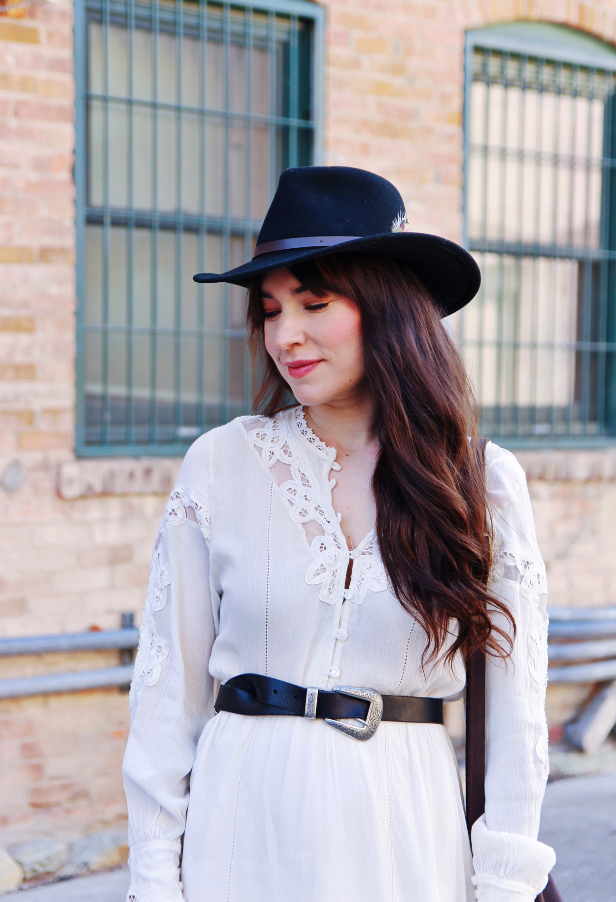 Outfit Details: Hat: Chapel hats / Dress: Free People / Belt: Urban Outfitters / Boots: Thrifted
