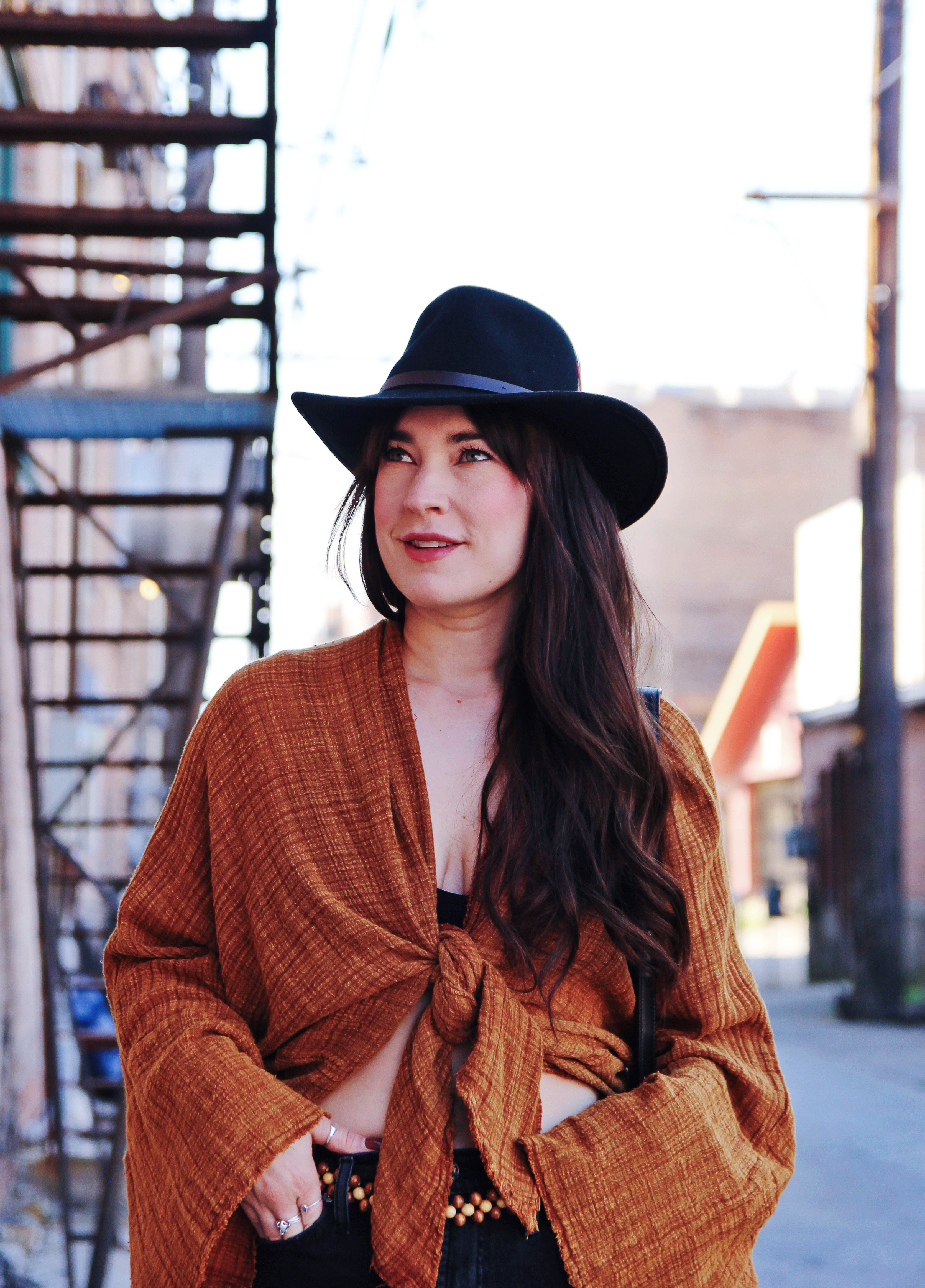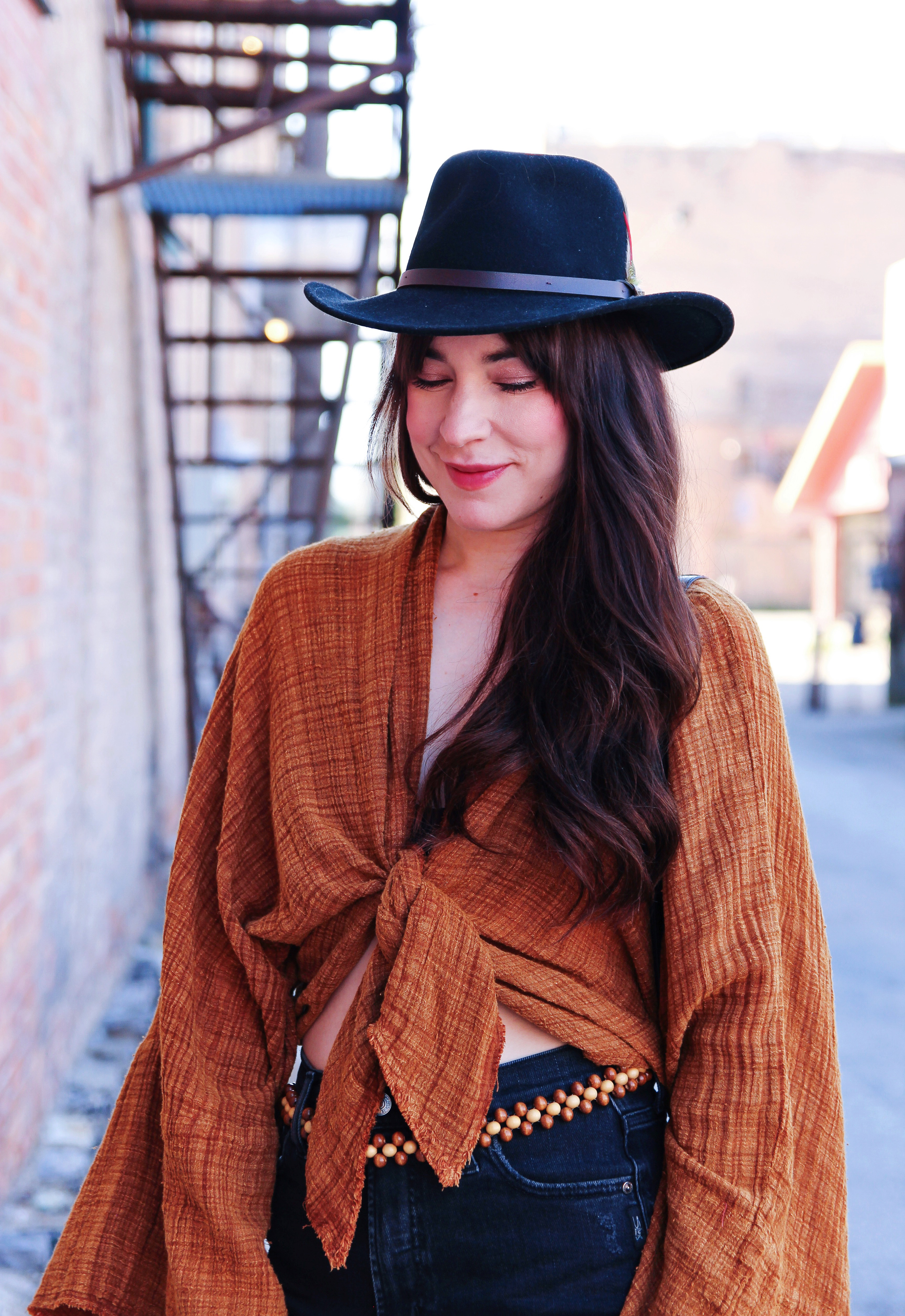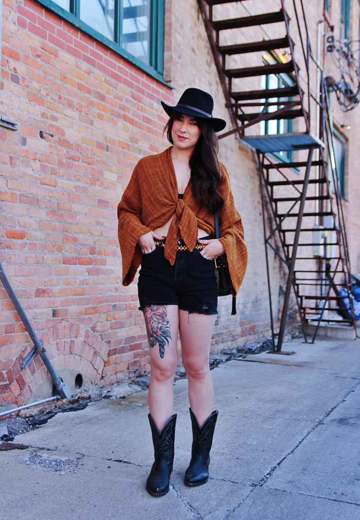This top from Free People is the newest addition to my wardrobe and I couldn’t be happier with it! Its extremely versatile, it can be worn on it’s own tied like I have it, or over another shirt as a shawl. For the rest of the look I chose some of my current favorites, including these black denim shorts. To accessorize I chose my favorite black hat, and cowboy boots.