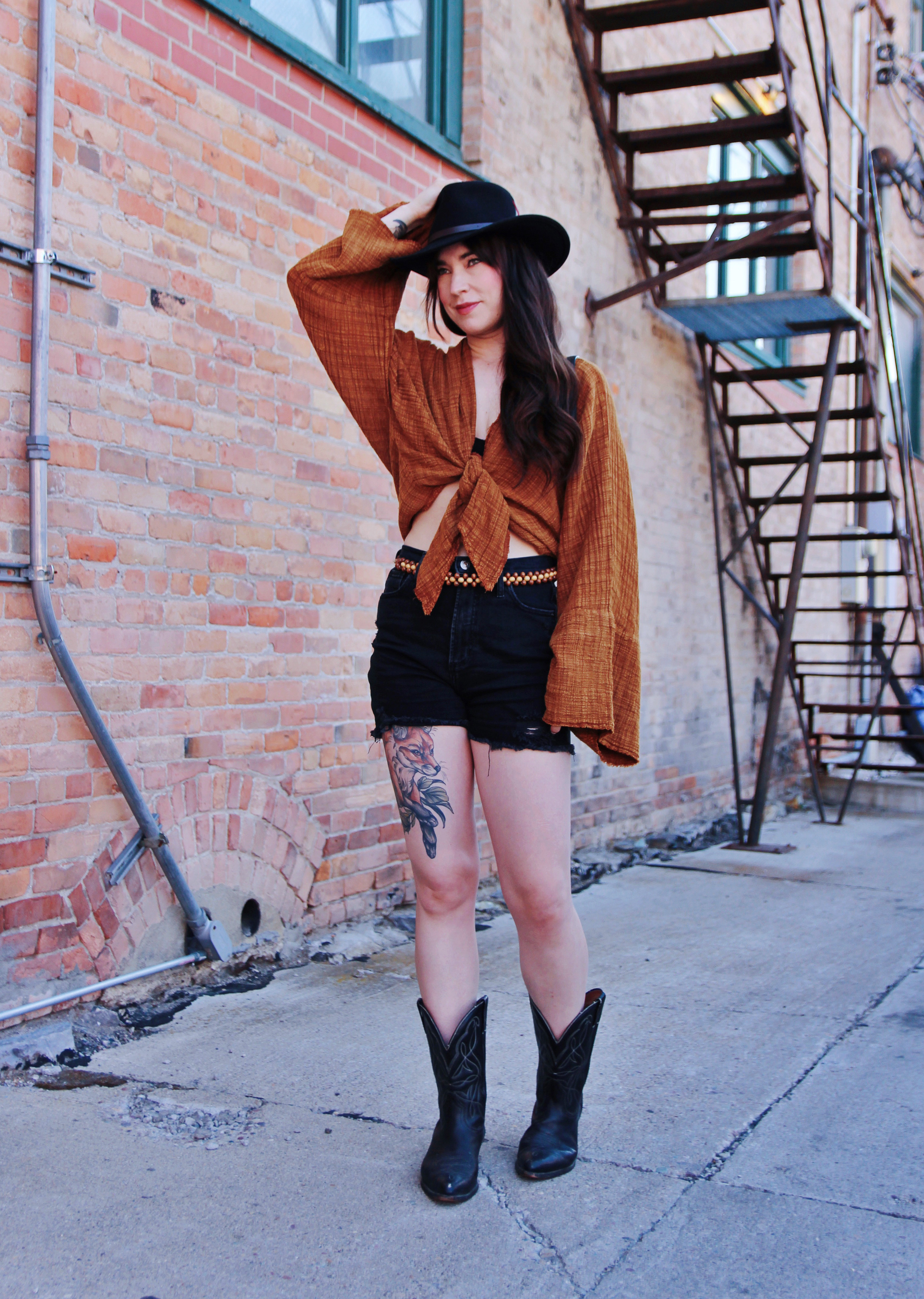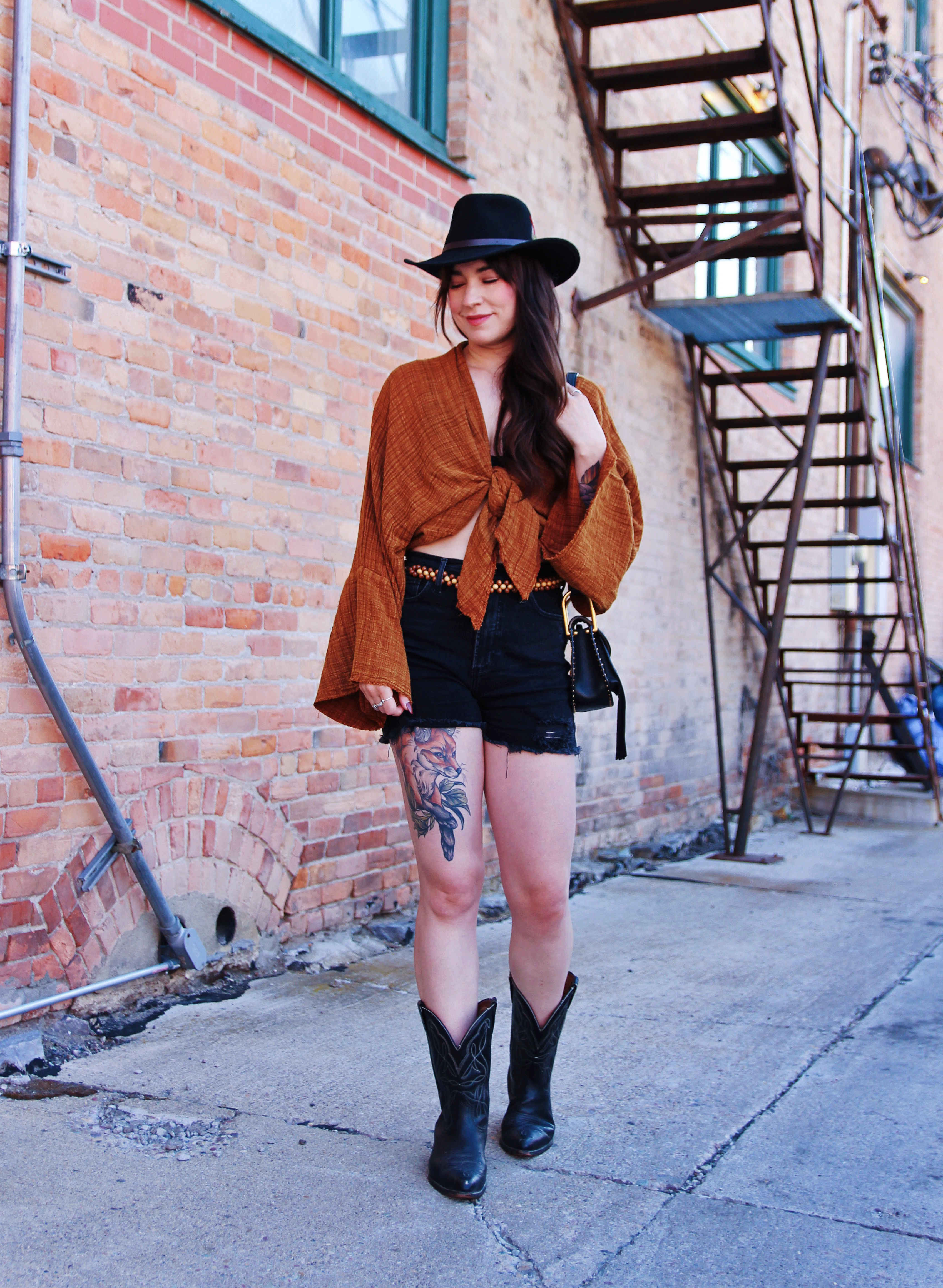 Outfit Details: Top: Free People / Shorts: Silver / Boots: Boulet (thrifted) / Hat: Chapel / Belt: Thrifted