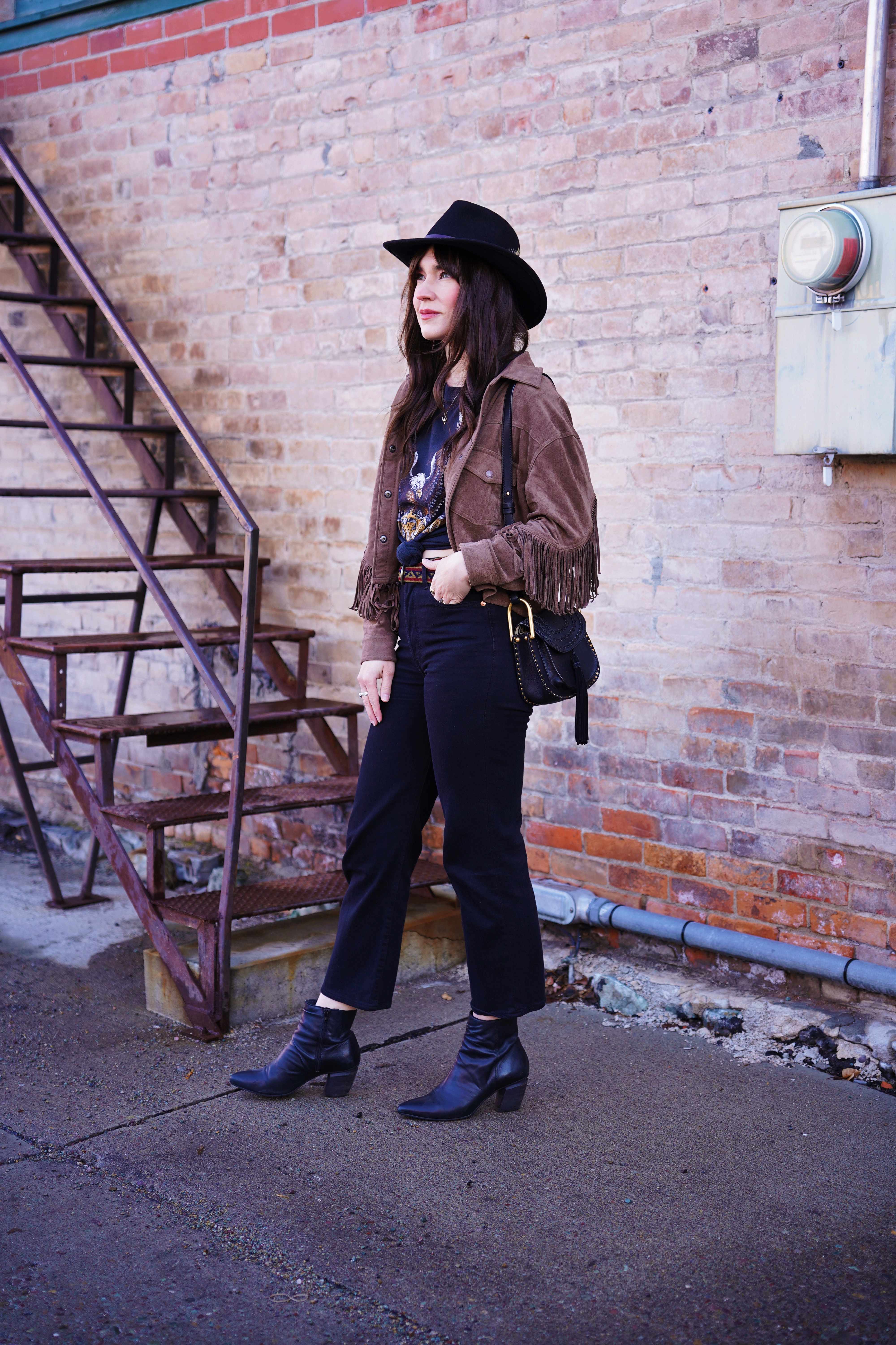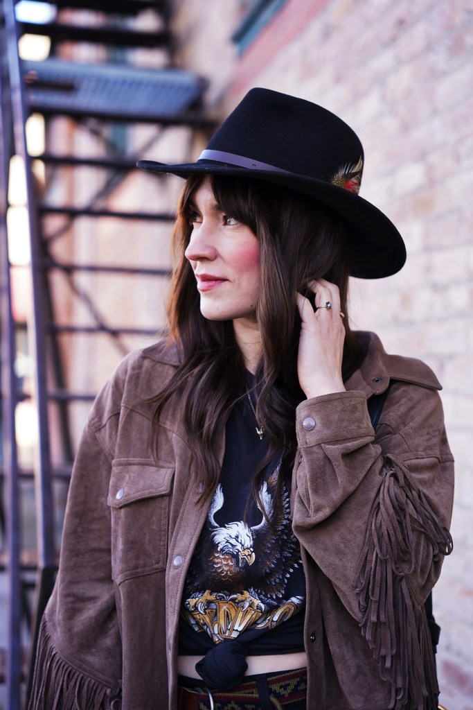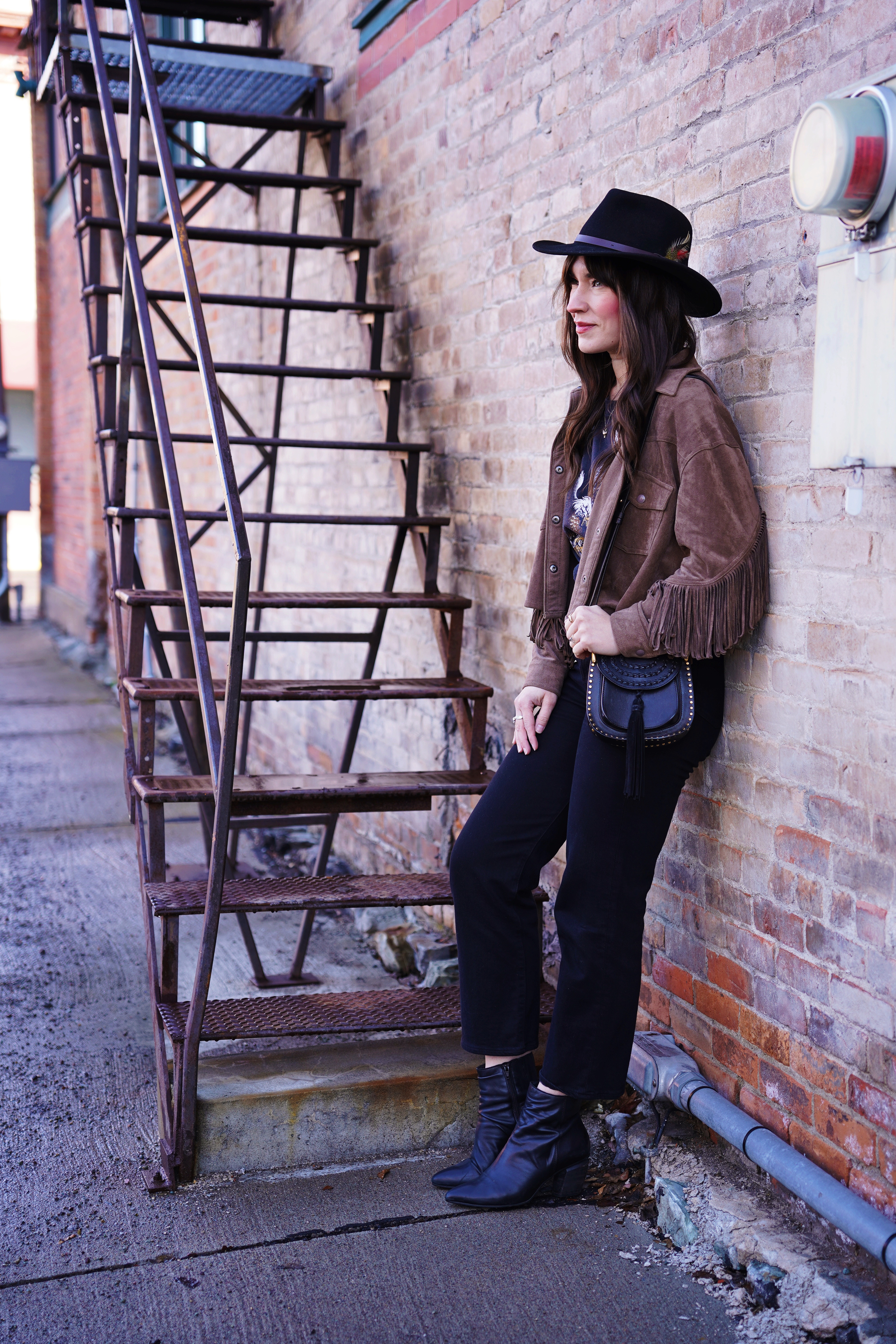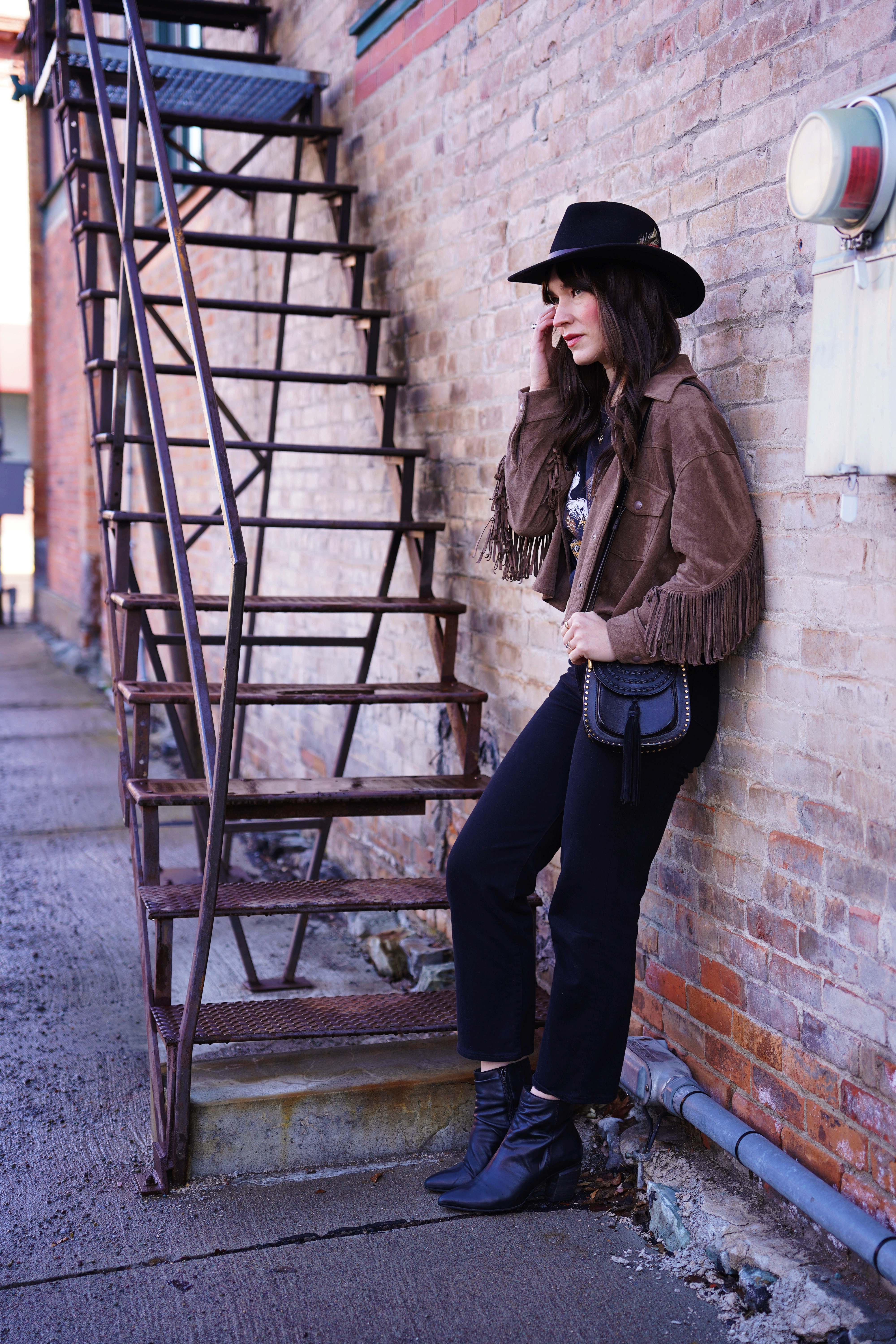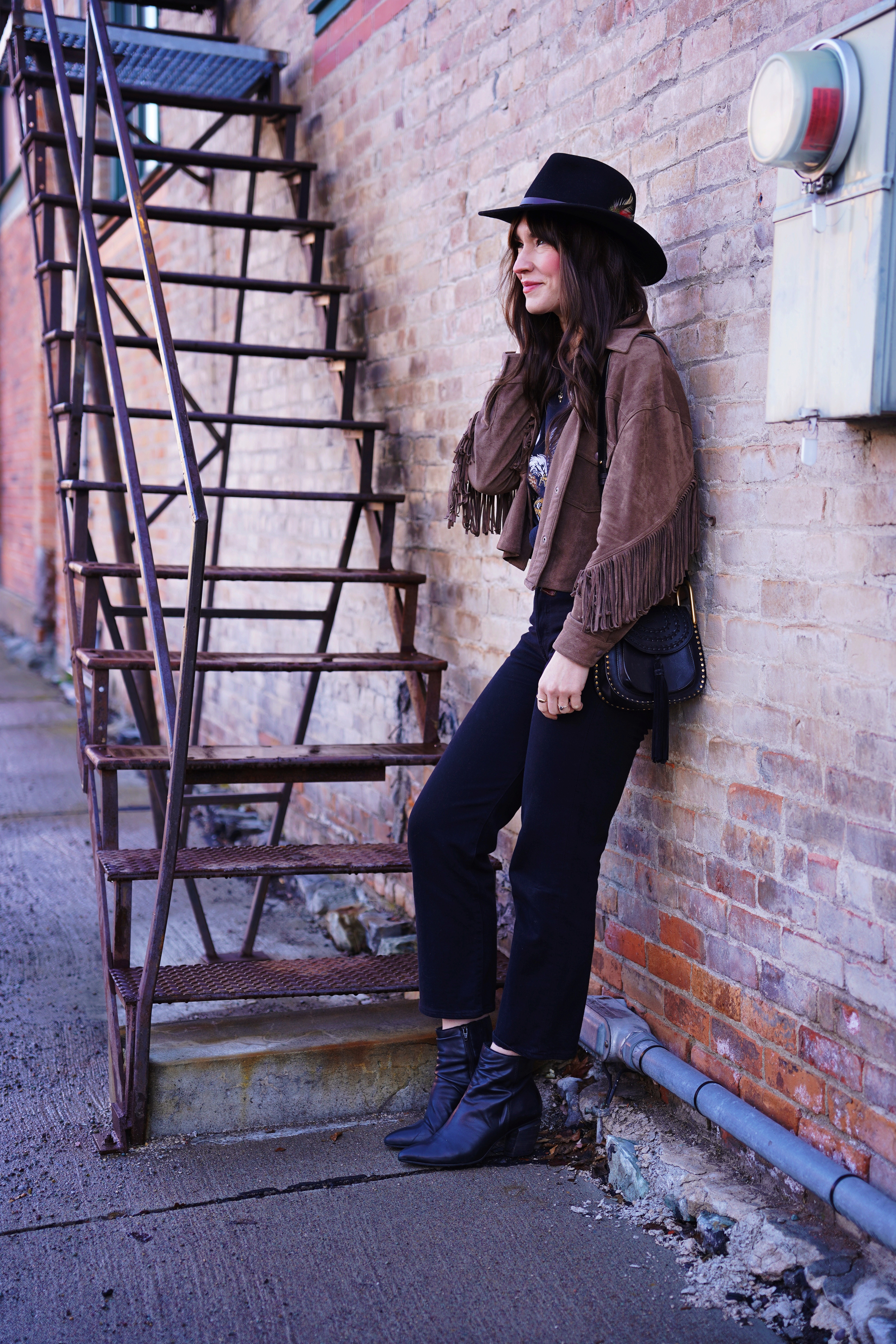 This time of year, the weather in Montana is all over the place, making it difficult to decide what to wear. Because of this, light layers are usually the way to go. In the spring I like to challenge myself to wear what I already have in my closet. I’ll think about adding new items when it really starts to warm up out there. This outfit consists of a few wardrobe staples, including this fringe jacket from Free People.