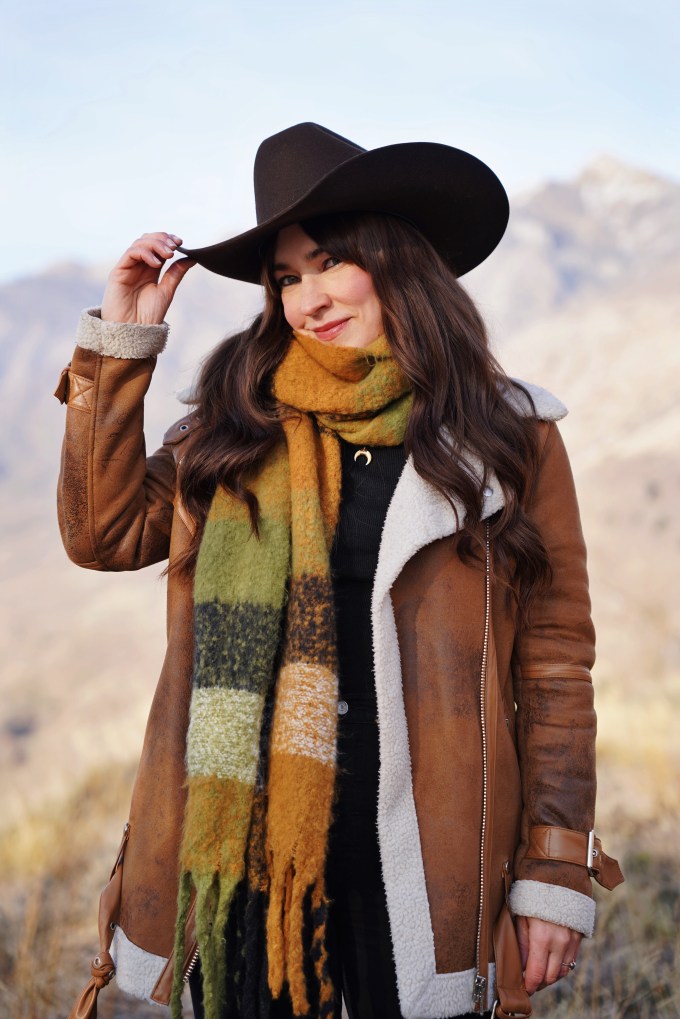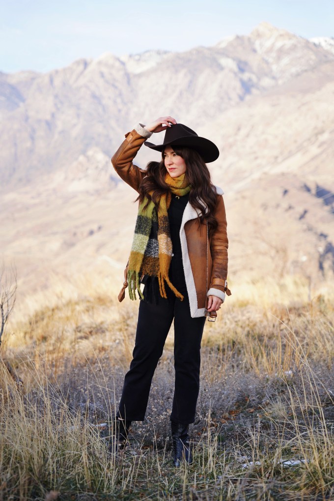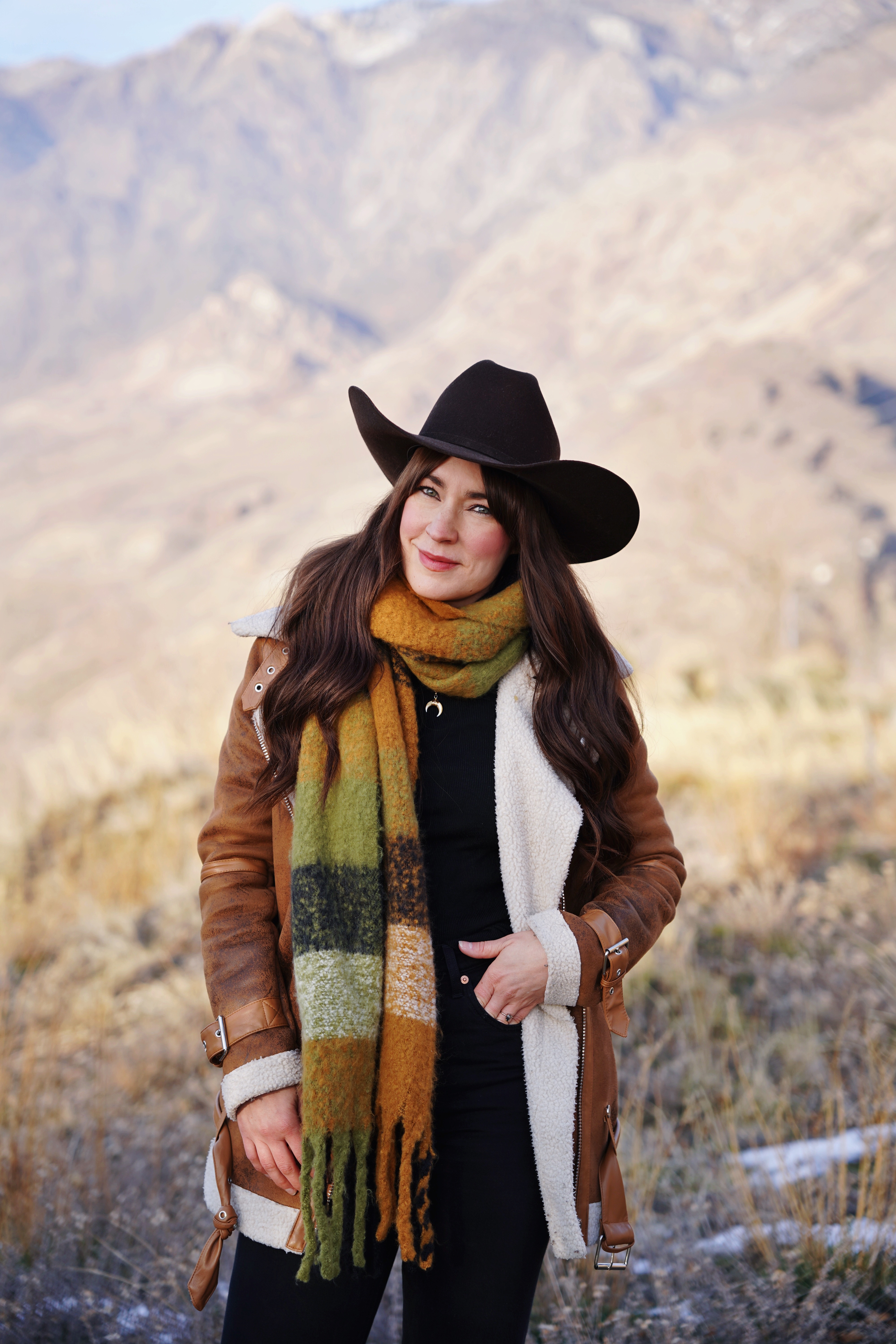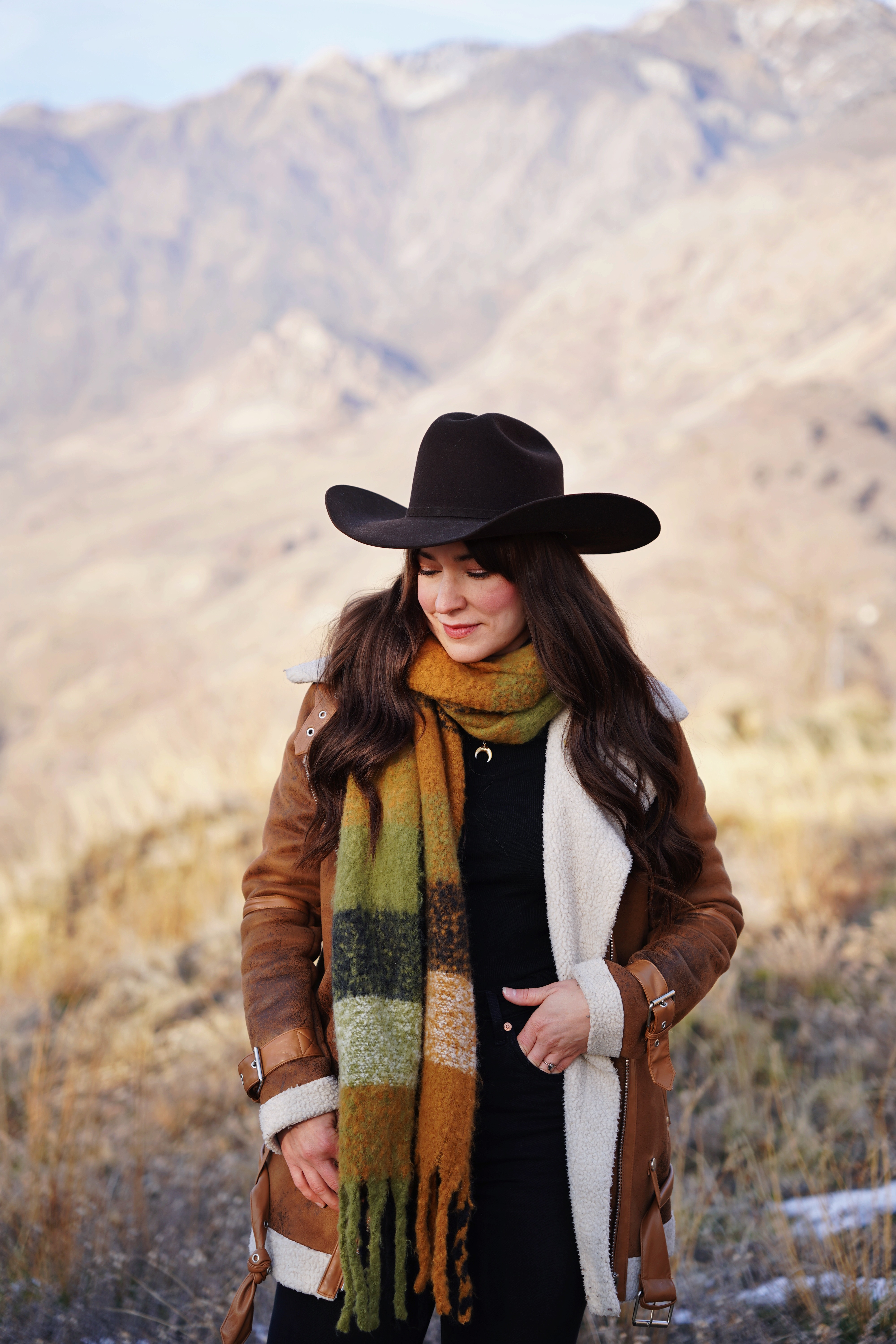 Because I’ve always lived in places with cold winters, i’ve amassed a fairly good sized collection of coats. This coat in particular as been a favorite of mine for some time now. It’s definitely a staple piece in my winter wardrobe! I kept the rest of the outfit basic with black jeans and a black top. For accessories, I added this fuzzy scarf, and one of my favorite cowboy hats. I love updating my regular outfits with new accessories. It’s an easy way to make an outfit feel new and fresh without replacing everything.