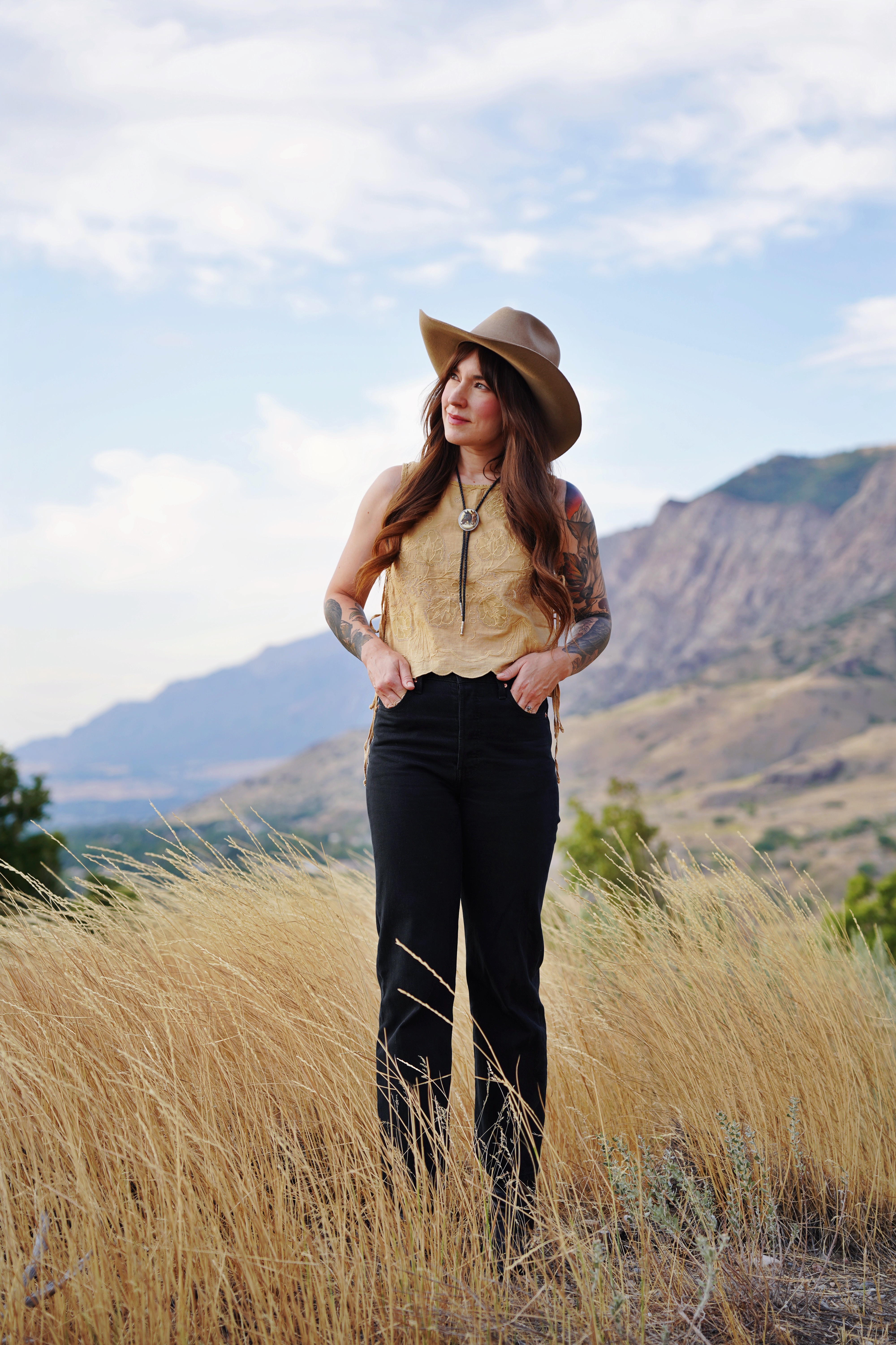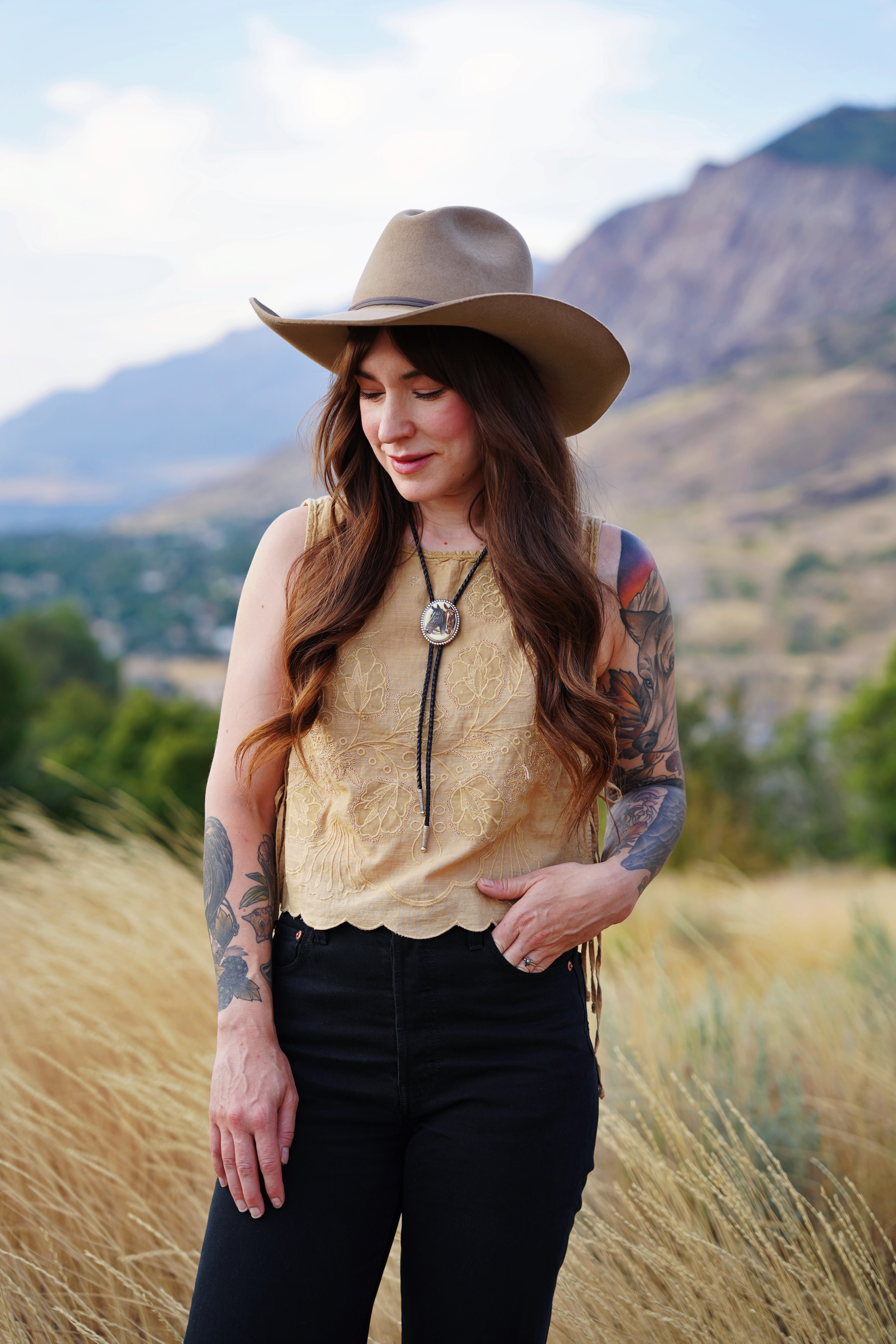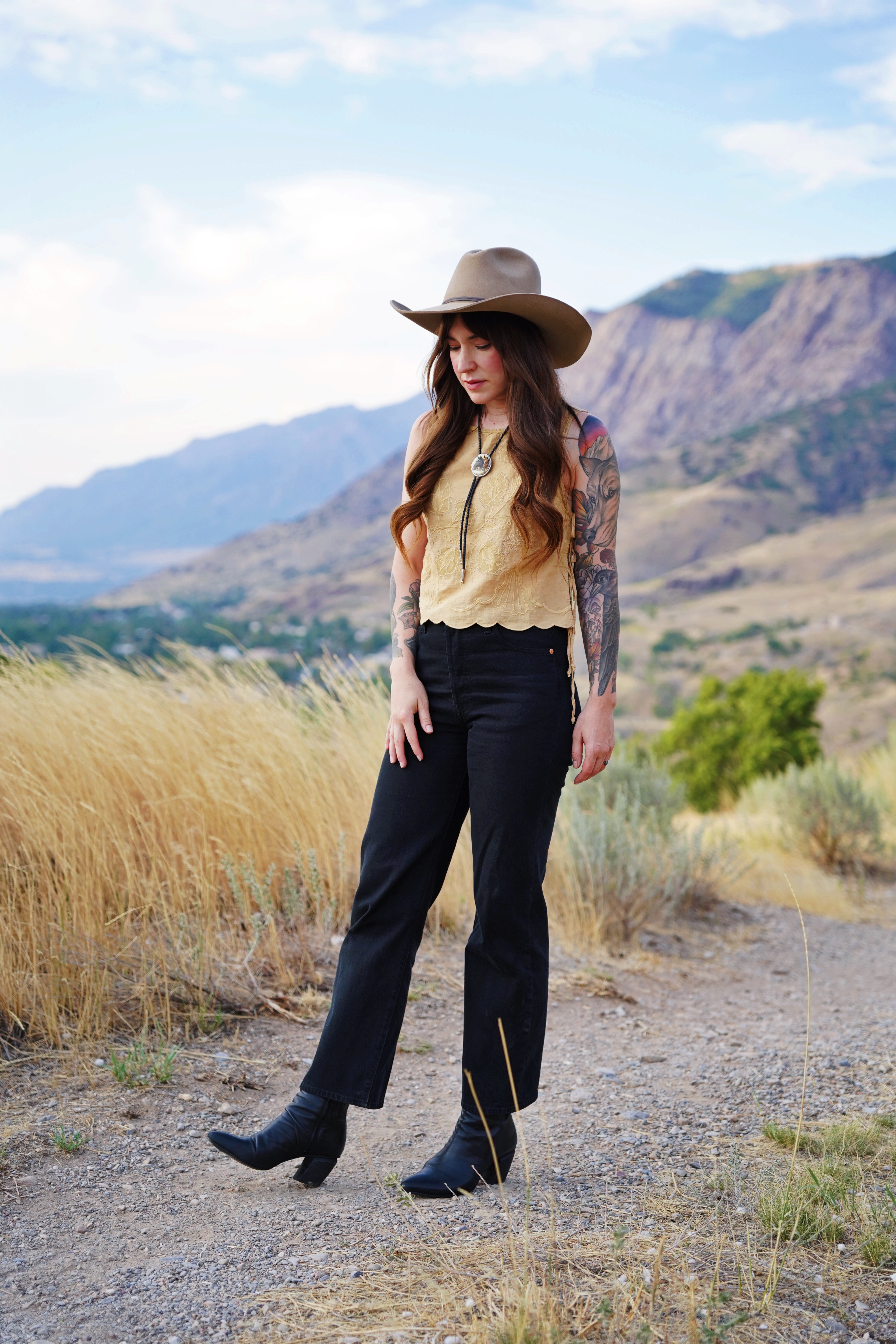 Outfit Details: Top: Free People / Jeans: Levi’s / Hat: Stetson / Bolo: Etsy / Boots: Miz Mooz