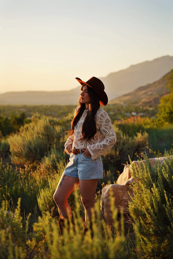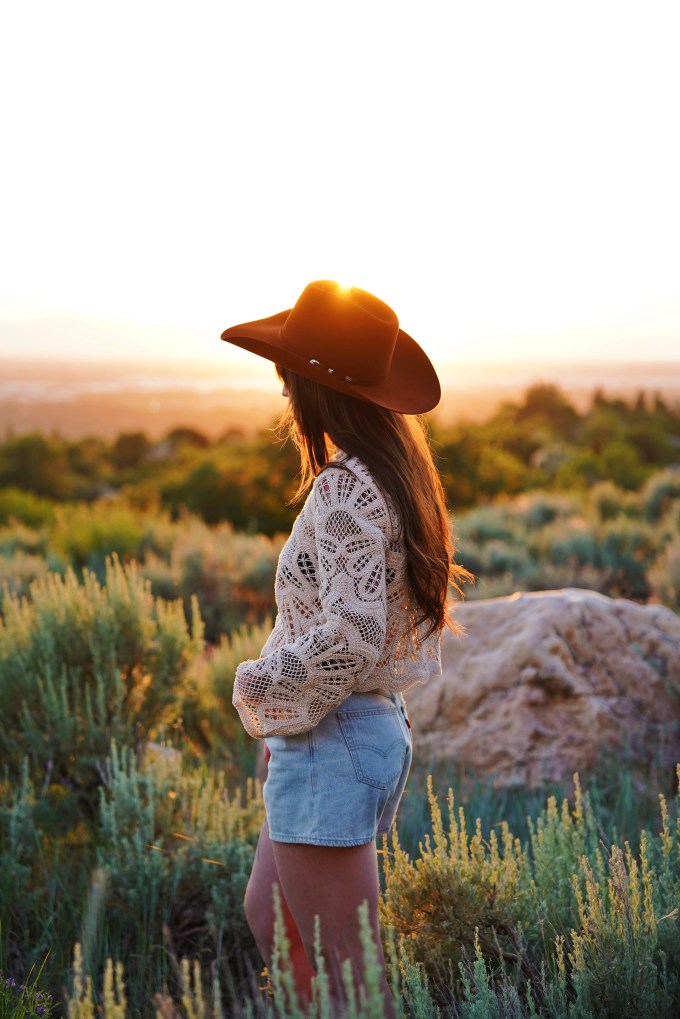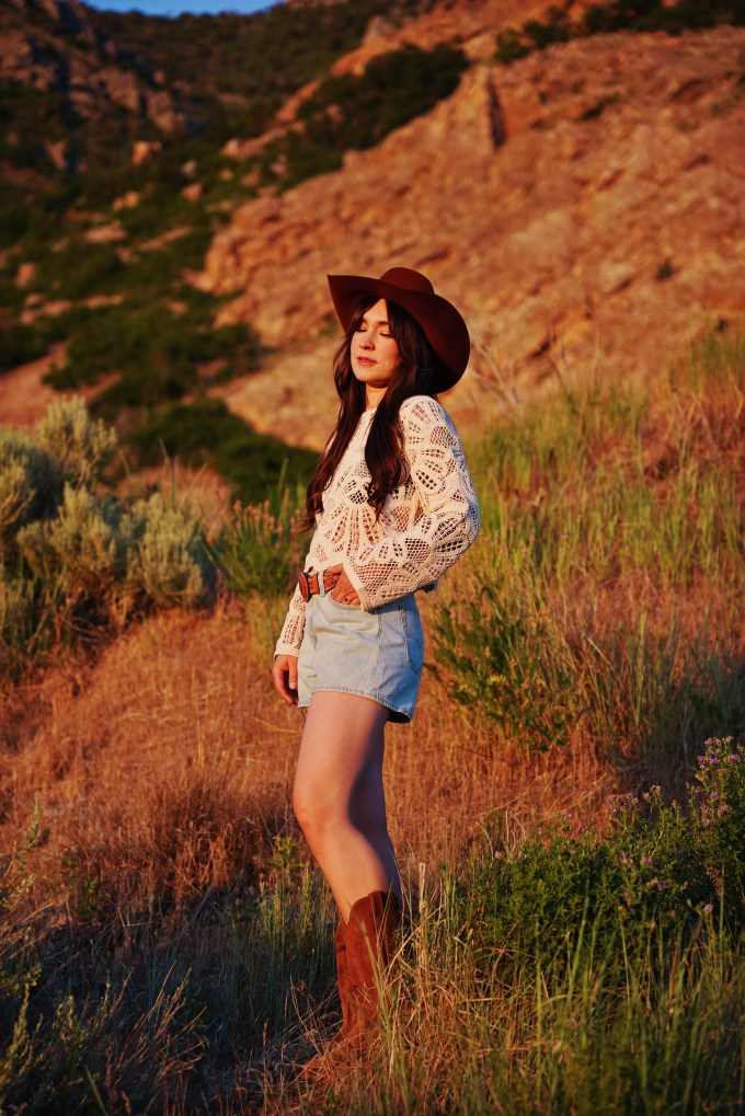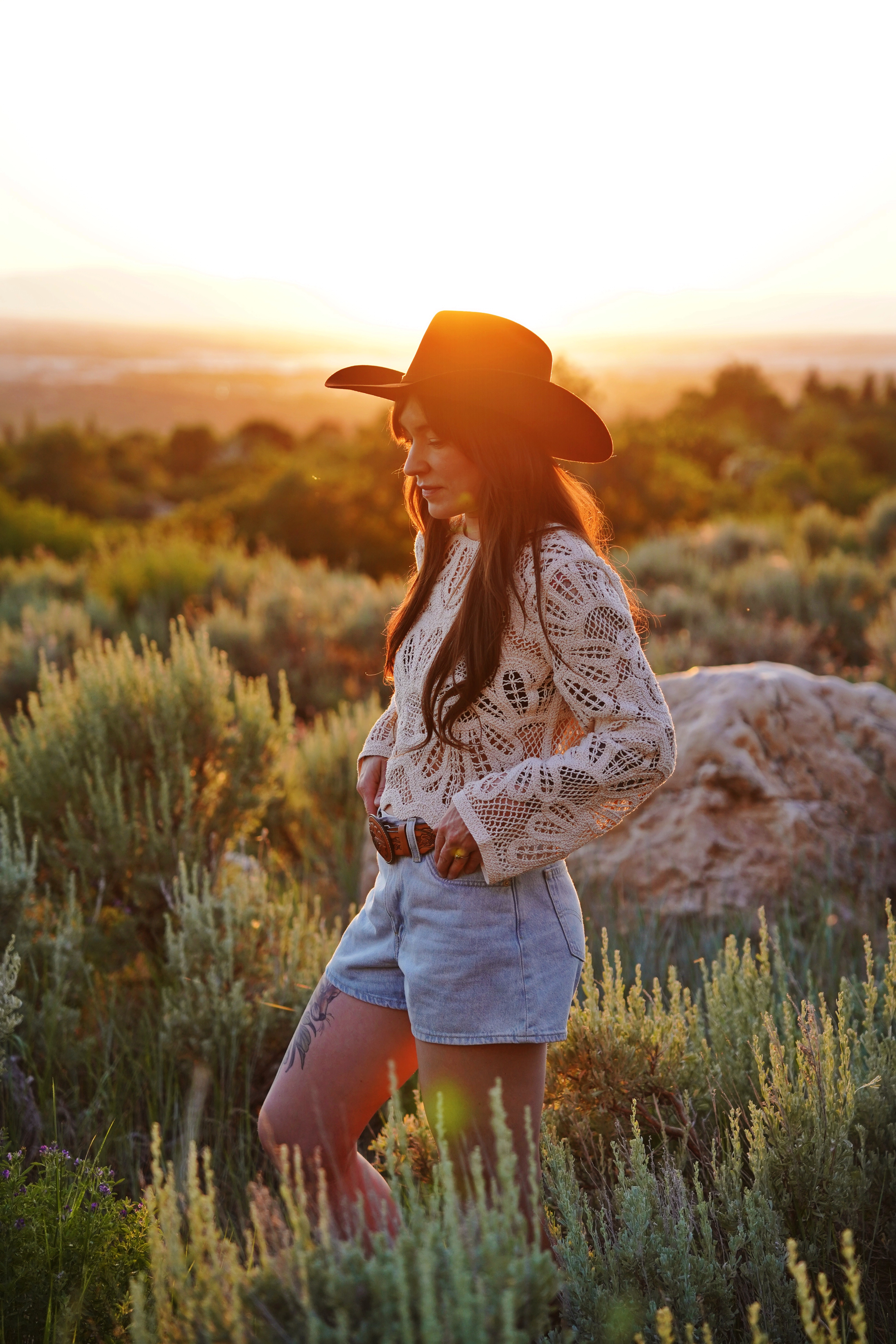 Outfit Details: Top: Sezane / Shorts: Levi’s / Hat: Resistol / Boots: Boulet / Belt: Good Gals Vintage
