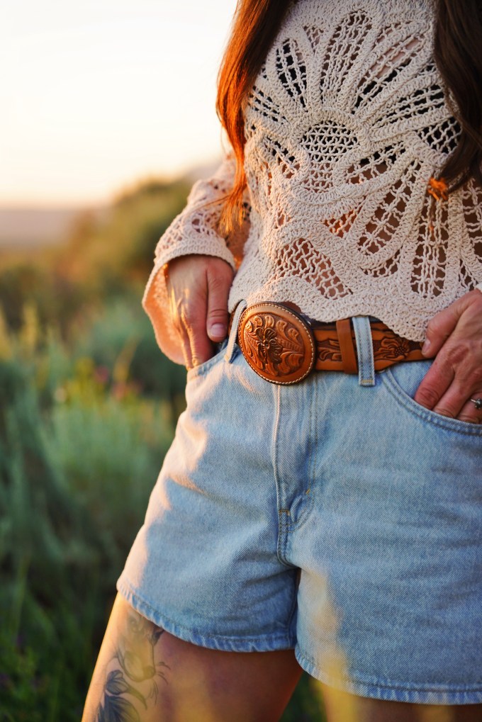 Summer outfits are always more challenging to put together than other seasons. When you can’t add layers like a jacket or sweater, you have to be a little more creative. I’ve been looking for tops like this one, with texture and patterns, to create a more interesting outfit. I paired it with shorts and this vintage tooled belt to add a little more detail.