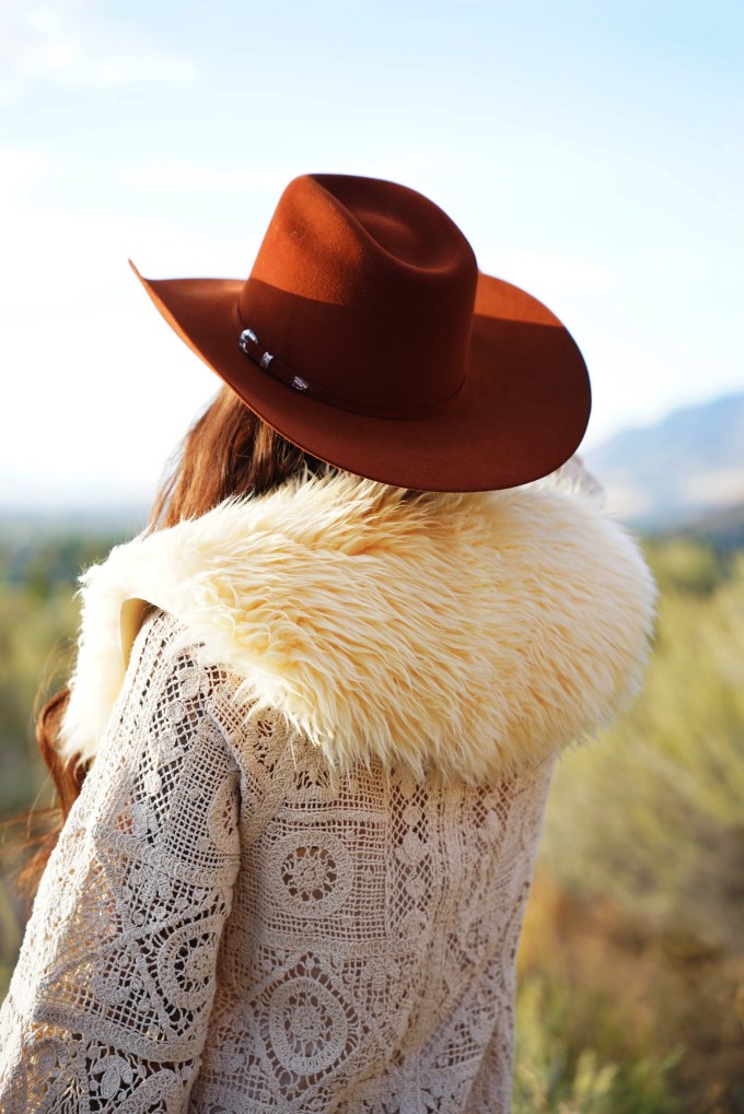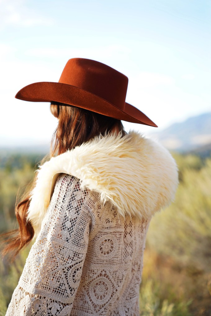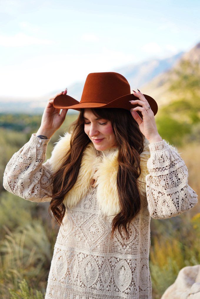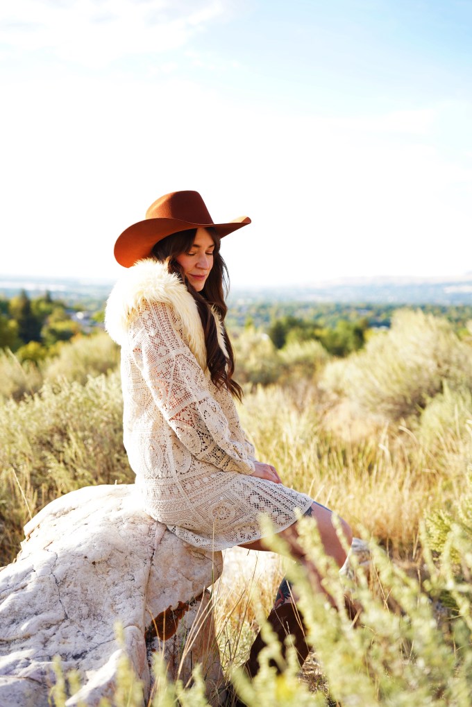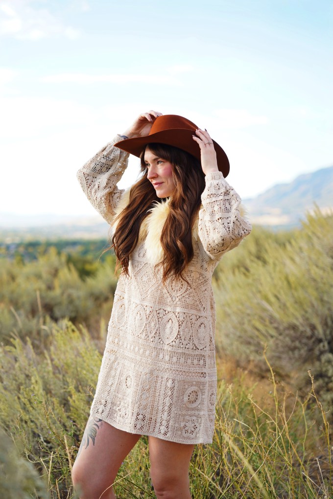 I’ve wanted a Ceremony Sheep Collar from Ida and Moon for a while now, so I’m really excited to finally have one! I’ve already been planning so many ways to wear it, especially when it gets a little colder out! For this outfit I chose a guipure dress from Sezane. I added one of my favorite cowboy hats, and suede cowboy boots to complete the look.