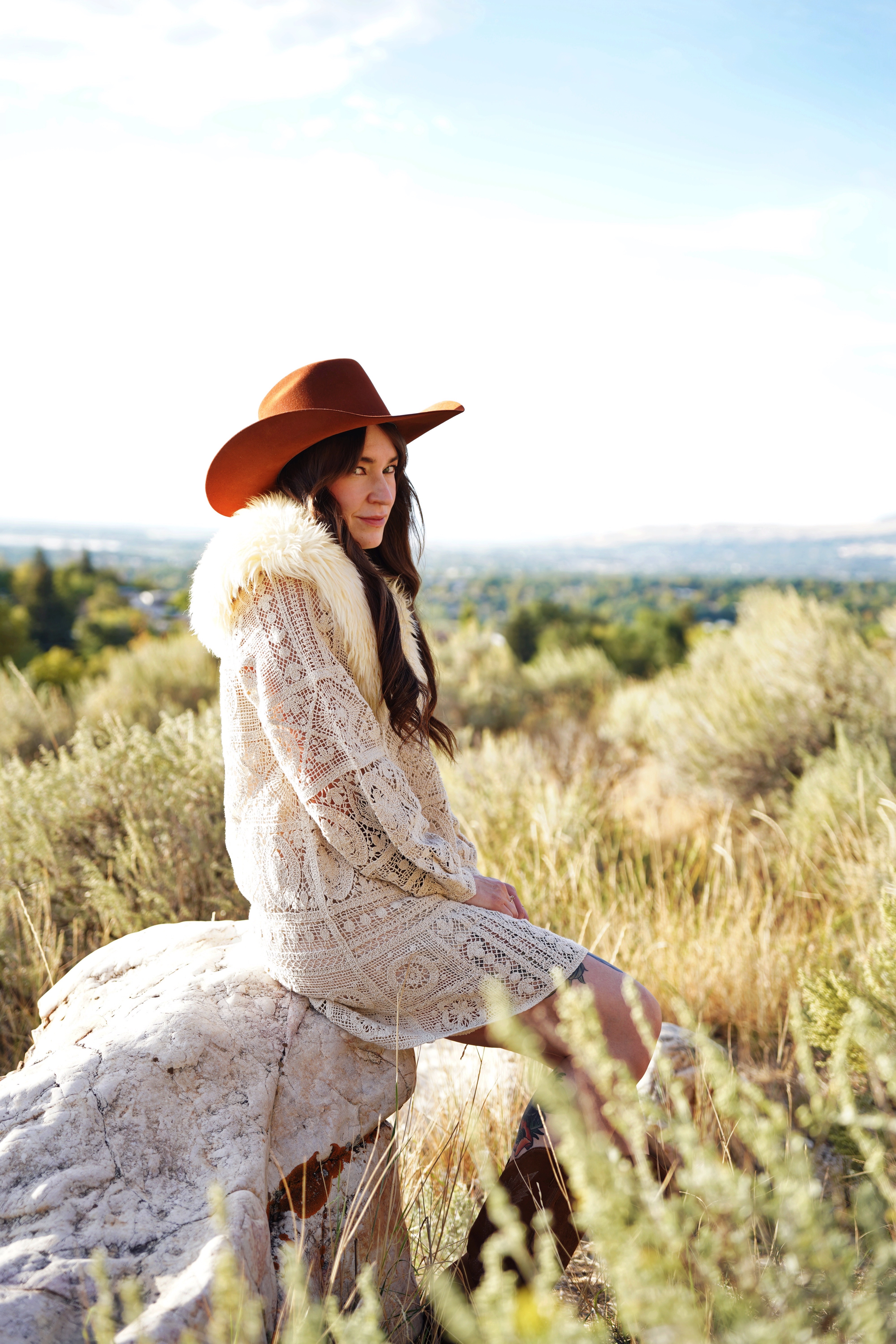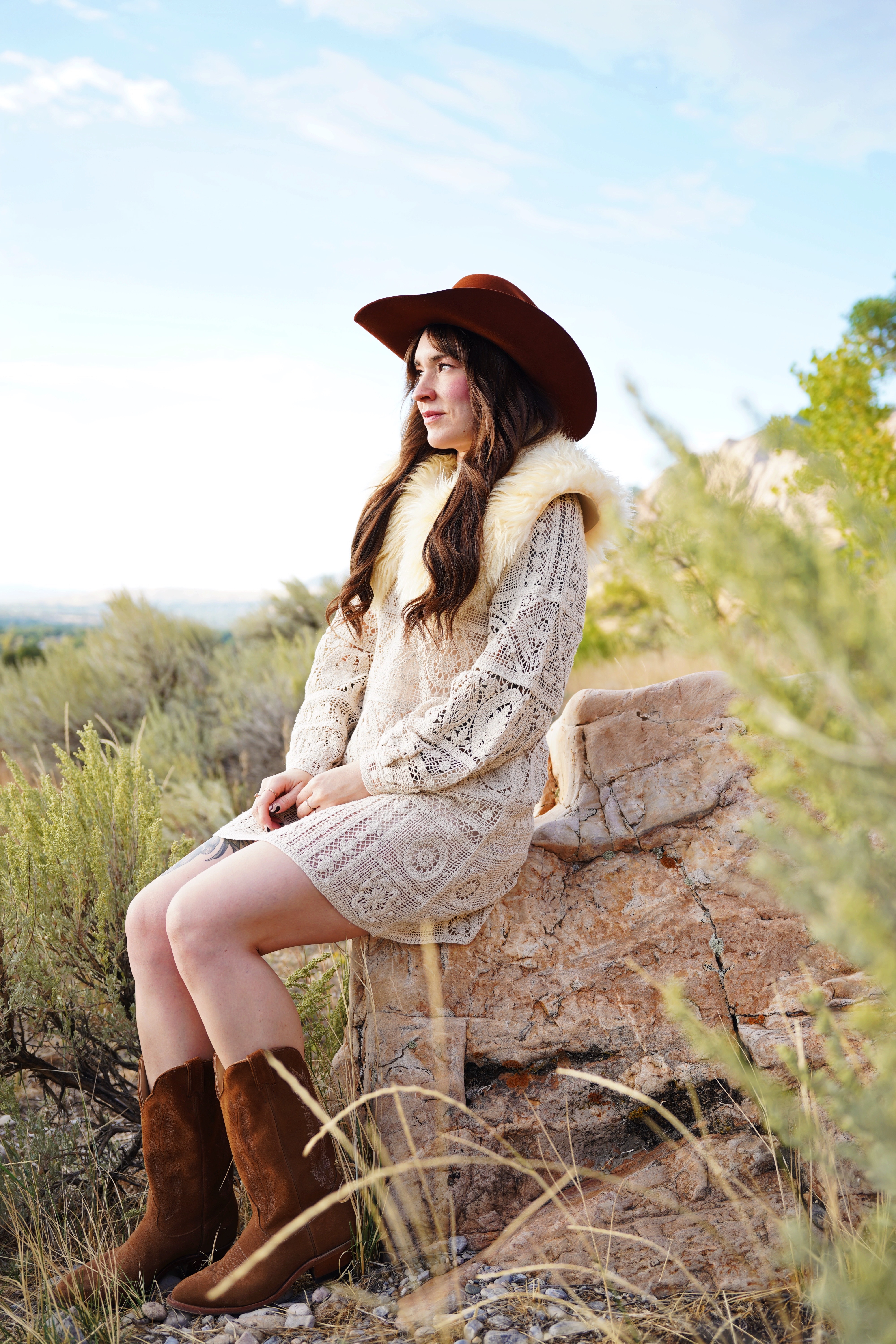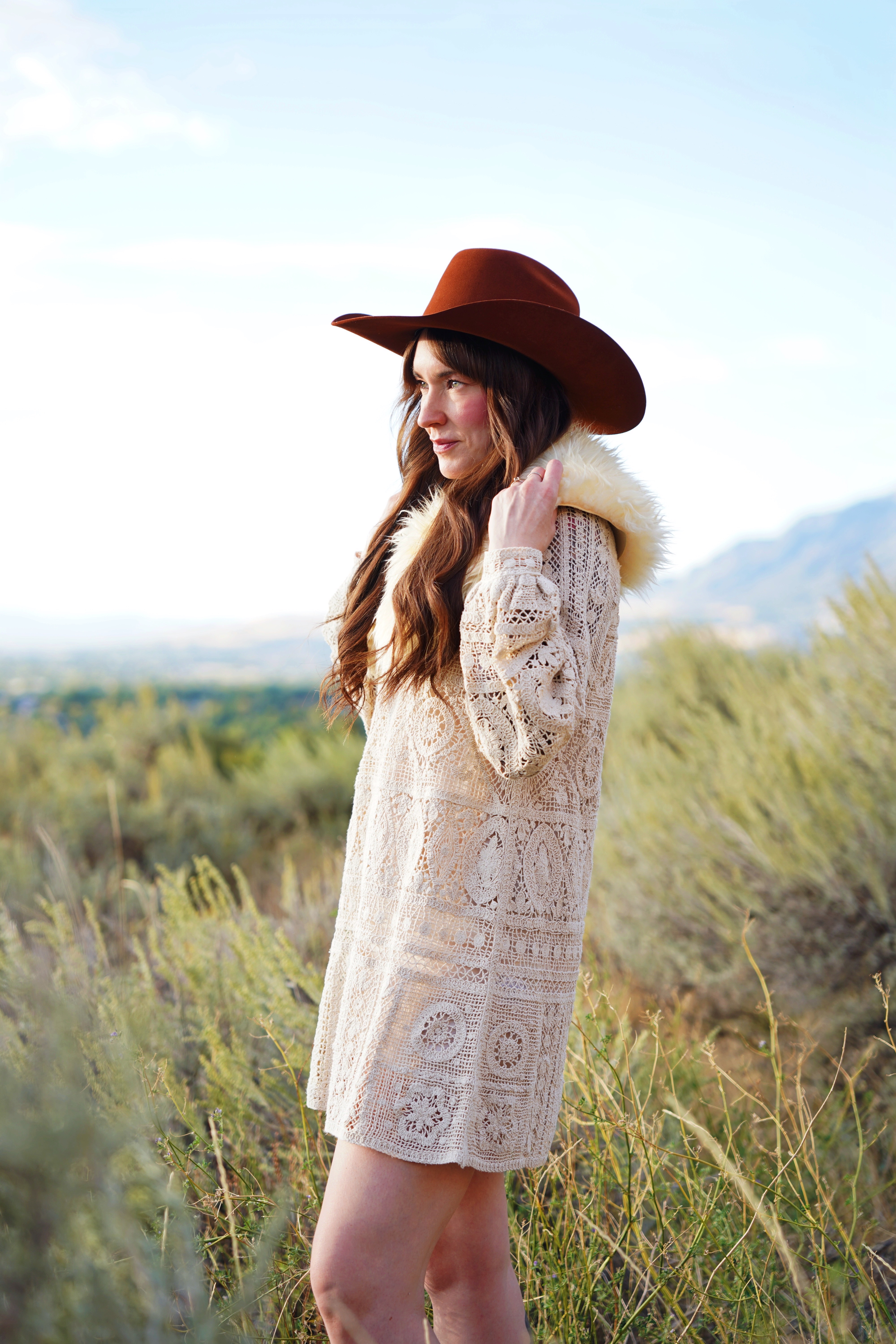 I’ve wanted a Ceremony Sheep Collar from Ida and Moon for a while now, so I’m really excited to finally have one! I’ve already been planning so many ways to wear it, especially when it gets a little colder out! For this outfit I chose a guipure dress from Sezane. I added one of my favorite cowboy hats, and suede cowboy boots to complete the look.