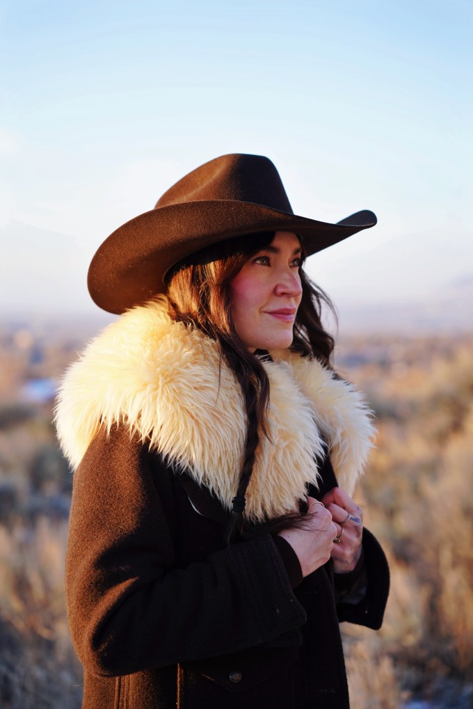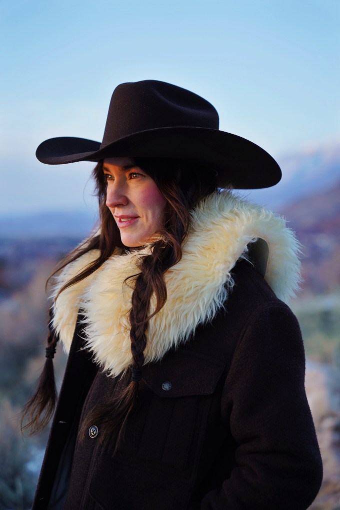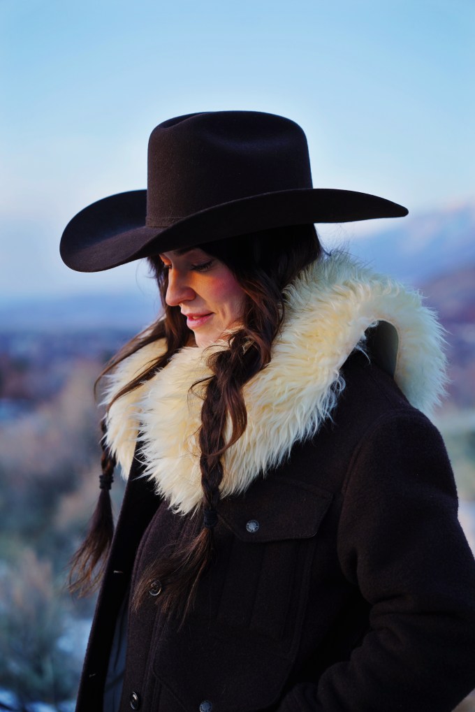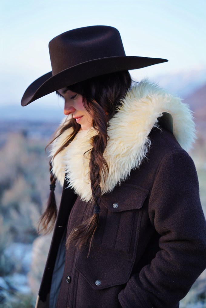 Outfit Details: Coat: Filson / Hat: Justin Hats / Collar: Ida and Moon / Pants: Levi’s / Boots: Miz Mooz
