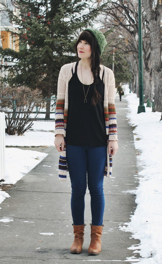 This outfit is defiantly a go to look for me in the winter. Sometimes It’s just easier to throw on a pair of jeans and a tank top. Add a cardigan and a beanie for warmth and be on your way. This is one of my all time favourite cardigans. It’s colourful but not too […]